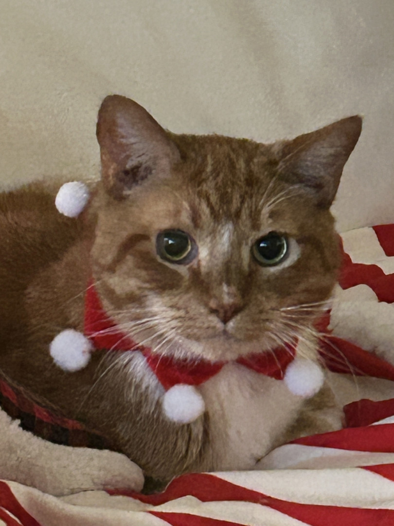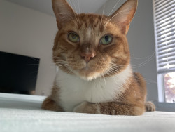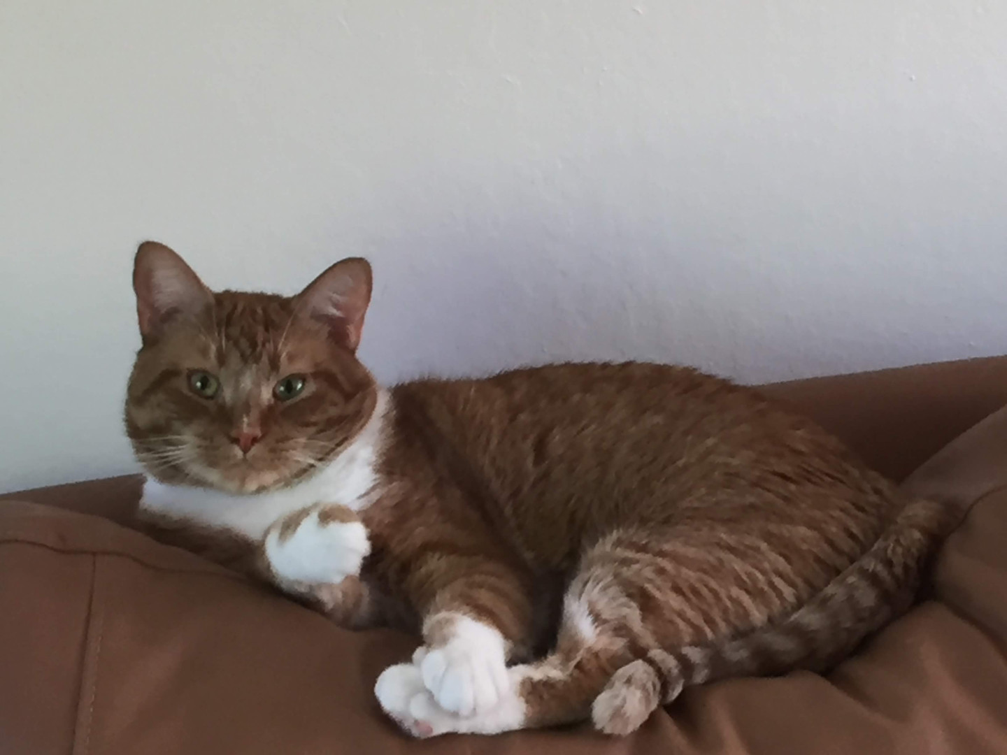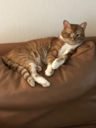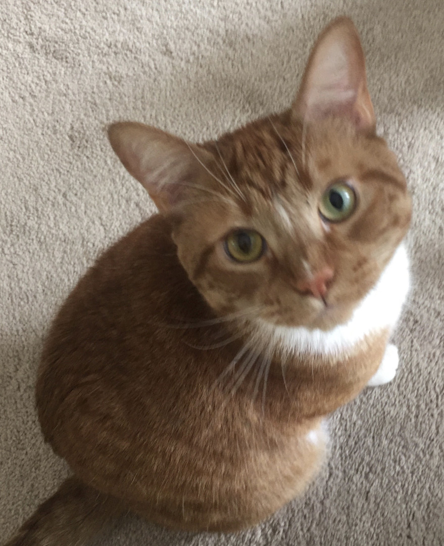 Orange and bold. Loving and precious. Rescued in 2016 in the San Francisco Bay Area. Adopted in 2017. Now lives in Canada. Most content boy.