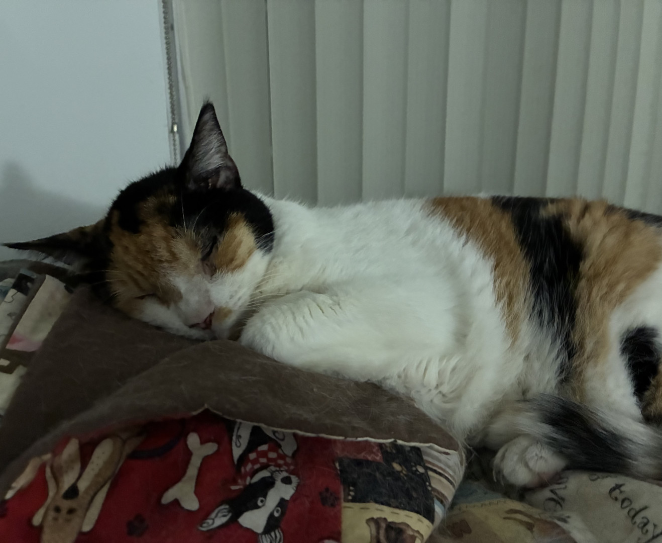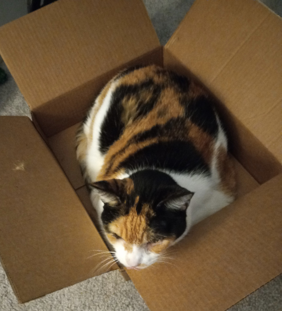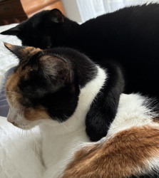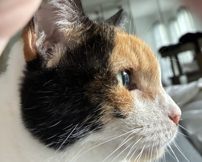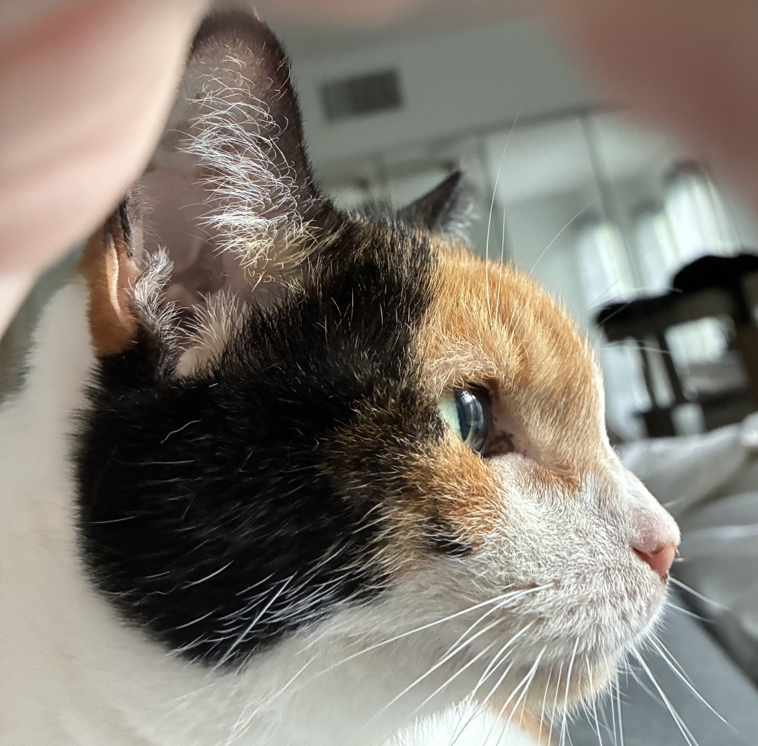 Purrlina is a sweet, friendly Calico girl who greets everyone at the door asking for pets and loves to snuggle on my lap or chest to nap.