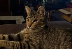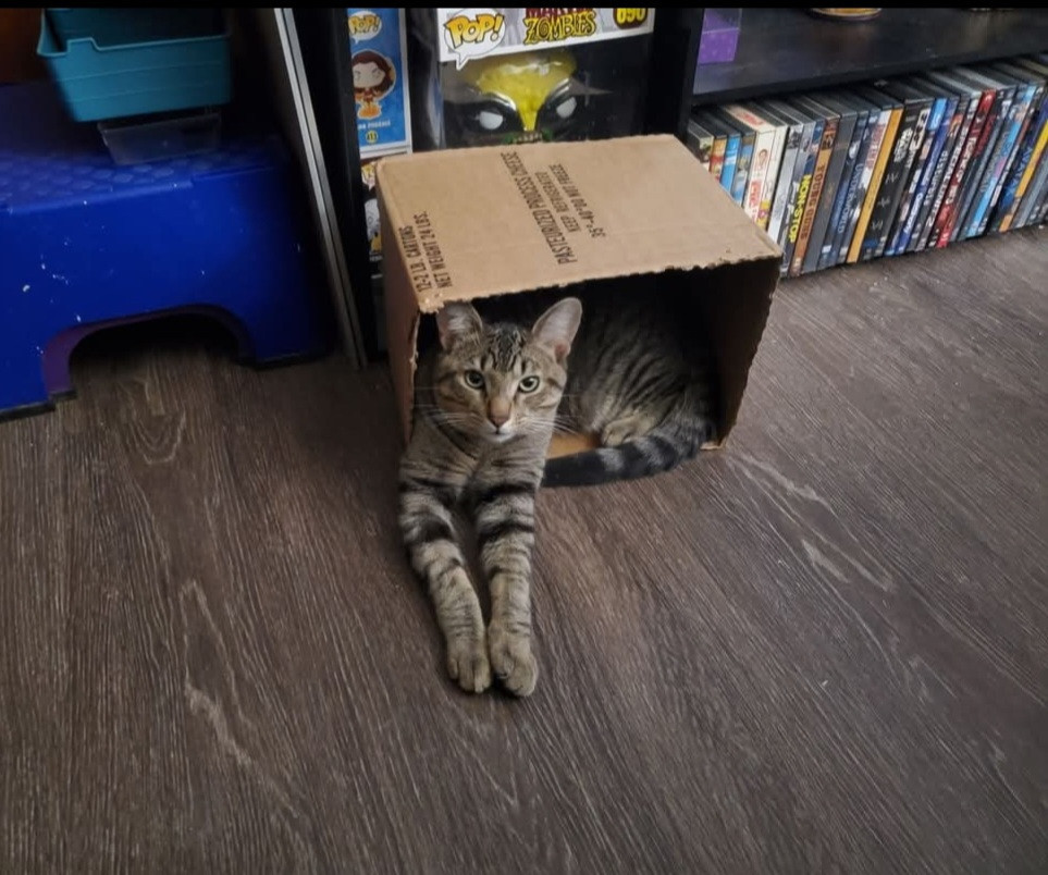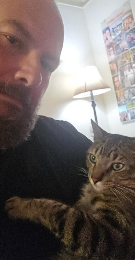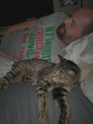 He is a street cat, that I adopted, and loves to eat, get treats, toys, and all the love in the world. He loves his mommy, and I love him.