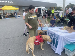 He is my dog guide and he makes people happy like I do bocci ball and he is always happy to see them he makes everyone at bocci ball happy and smile when he runs around the church floor and everyone plays with him