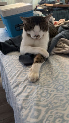 Rango is a male cat. He’s very active and loves playing with dog toys! He thinks he’s a mere cat in the picture!