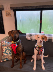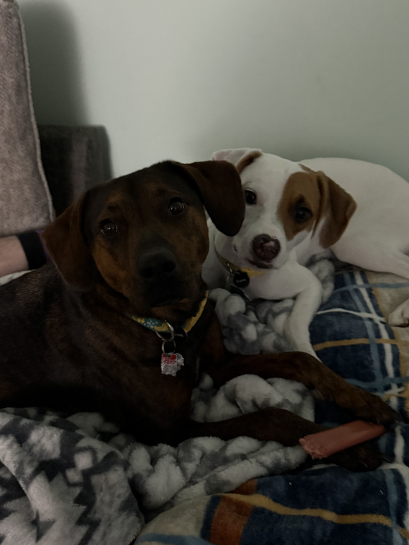 We rescued our girls in 2023 and 2024. Raya (brown dog) was recused from a kill shelter in Kentucky and Olivia (white dog) was found in WV.