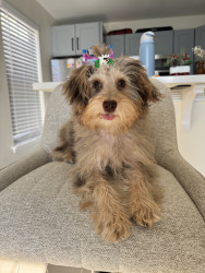 Reece’s most unique quality is her ability to make people laugh. She is the goofiest pup that has the best facial expressions and quirky actions that make you question how she even did that. She also knows how to rock a bow and matching outfit.