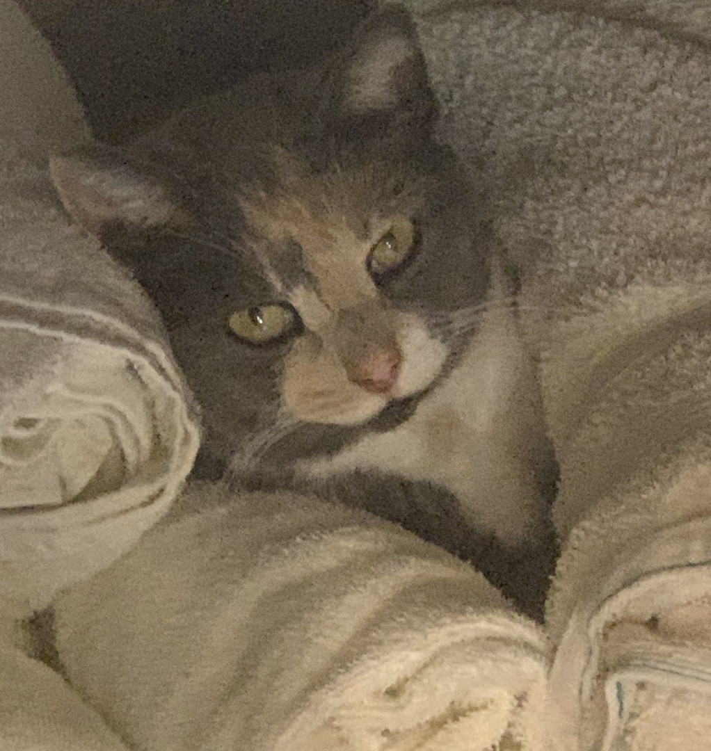 Ressies is a calico with soft fur, a sassy personality, and a heart full of love on her terms. Daughter of our beloved Mama Cat, She loves to sneak under the bed at night and leap onto it, startling me for snuggles she demanded, meows like a tiny boss at doors, pats my head when she wants out, has even proudly delivered mice to the door, and will loudly let you know when she’s not having it. Curious, playful, and endlessly charming, Ressies turns every day into an adventure