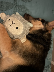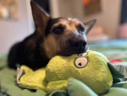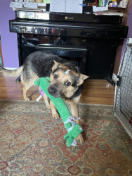 Rey absolutely adores her goat man toy, so much that I have to keep extras on hand because they constantly run out of stock and she has destroyed five of them so far! In the treat department, she loves her sweet potato cookies from the natural grocery store.