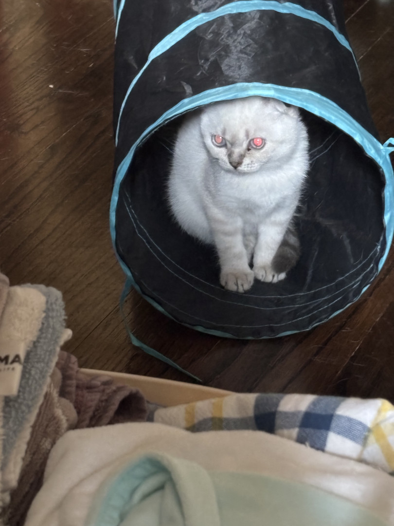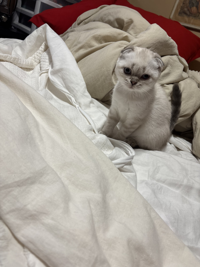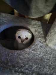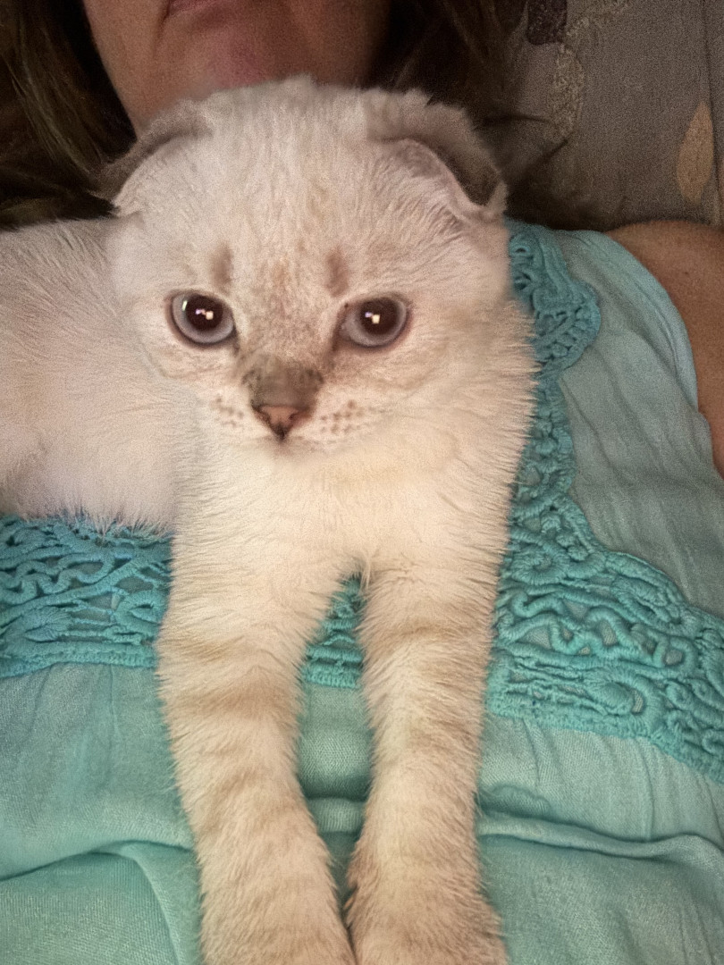 Rey is about eight months old. She is a Scottish fold. loving kitten. She loves to cuddle and be next to you. She is just a very loving cat