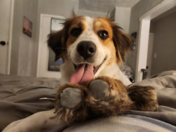 Reyna doesn't discriminate when it comes to toys or treats. She loves a good game of tug of war with a classic rope toy but will also rip apart anything she gets her paws on, such as a plastic bag. Lately Reyna has been loving homemade pumpkin and Greek yogurt frozen treats.