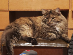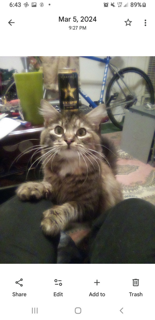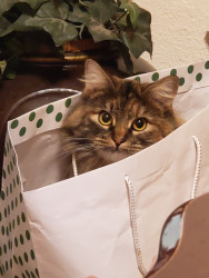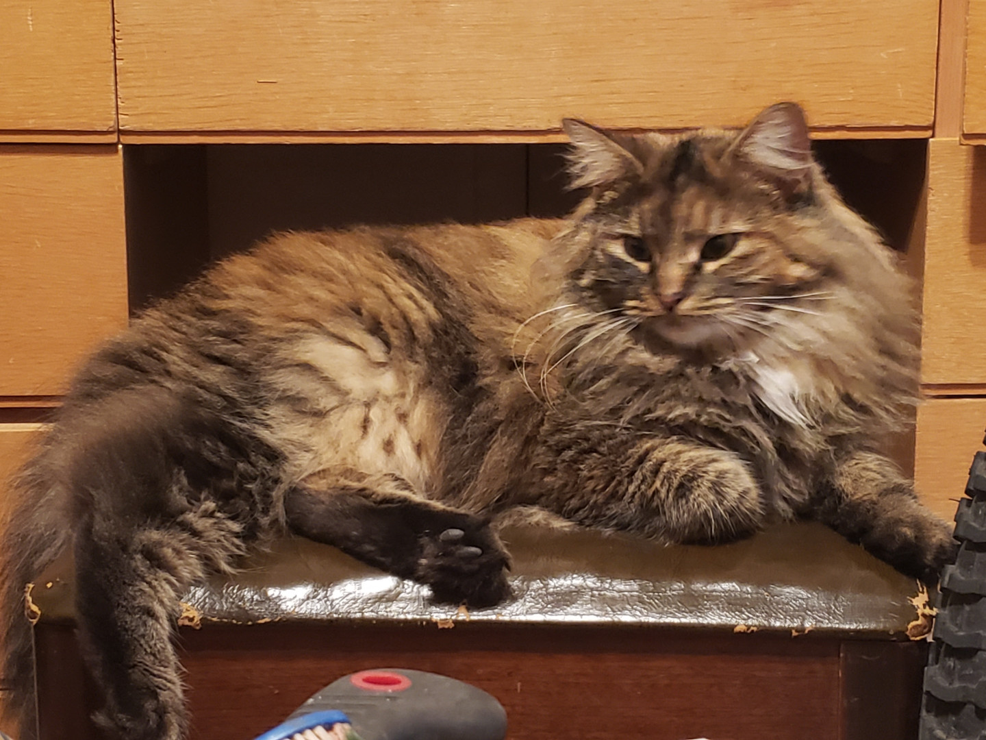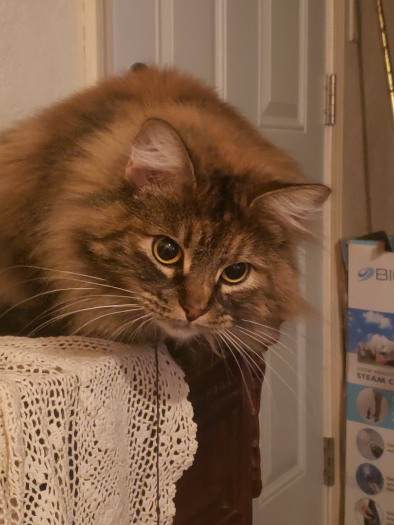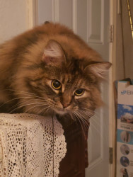 She has colorful thick fur. She is very loving, playful, strong-willed, great personality, with a mind of her own.