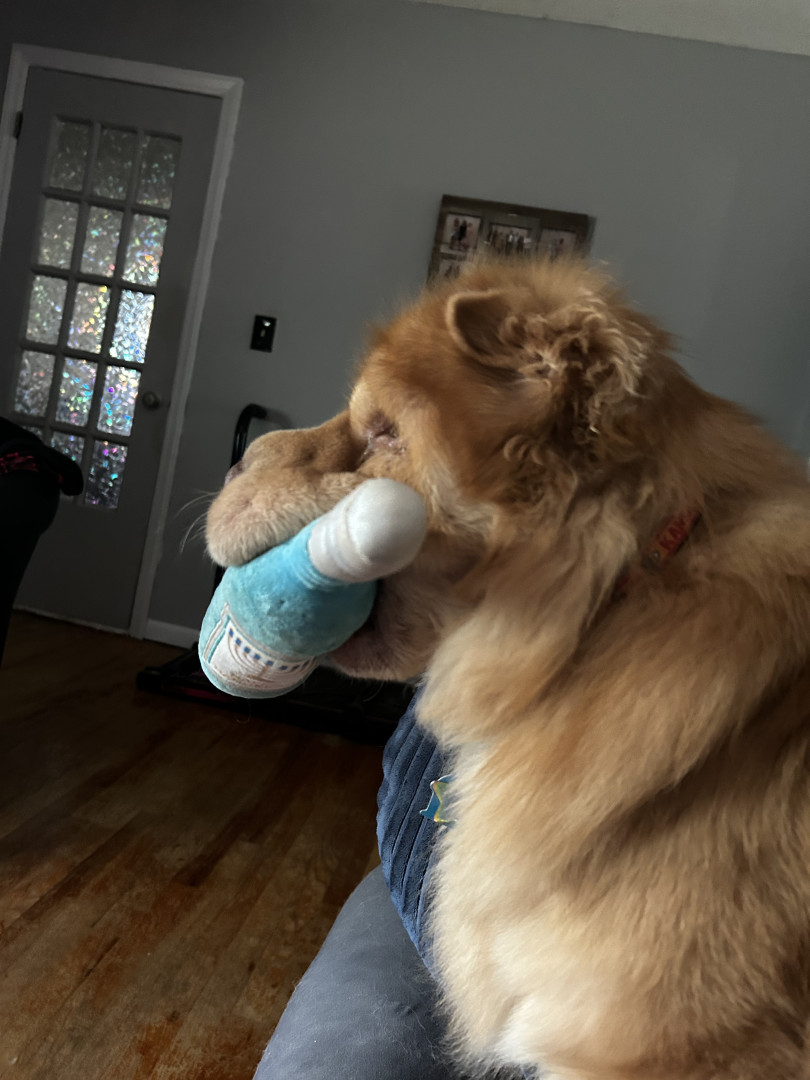 Learn MoreShe has so many!! A favorite has to be her squeaky wine bottle she loves that! A stuffed avocado and the squeaky opinion cup!! Her best treats are sandwich cookies from a local dog bakery. We sometimes share. They are people friendly and really good.