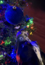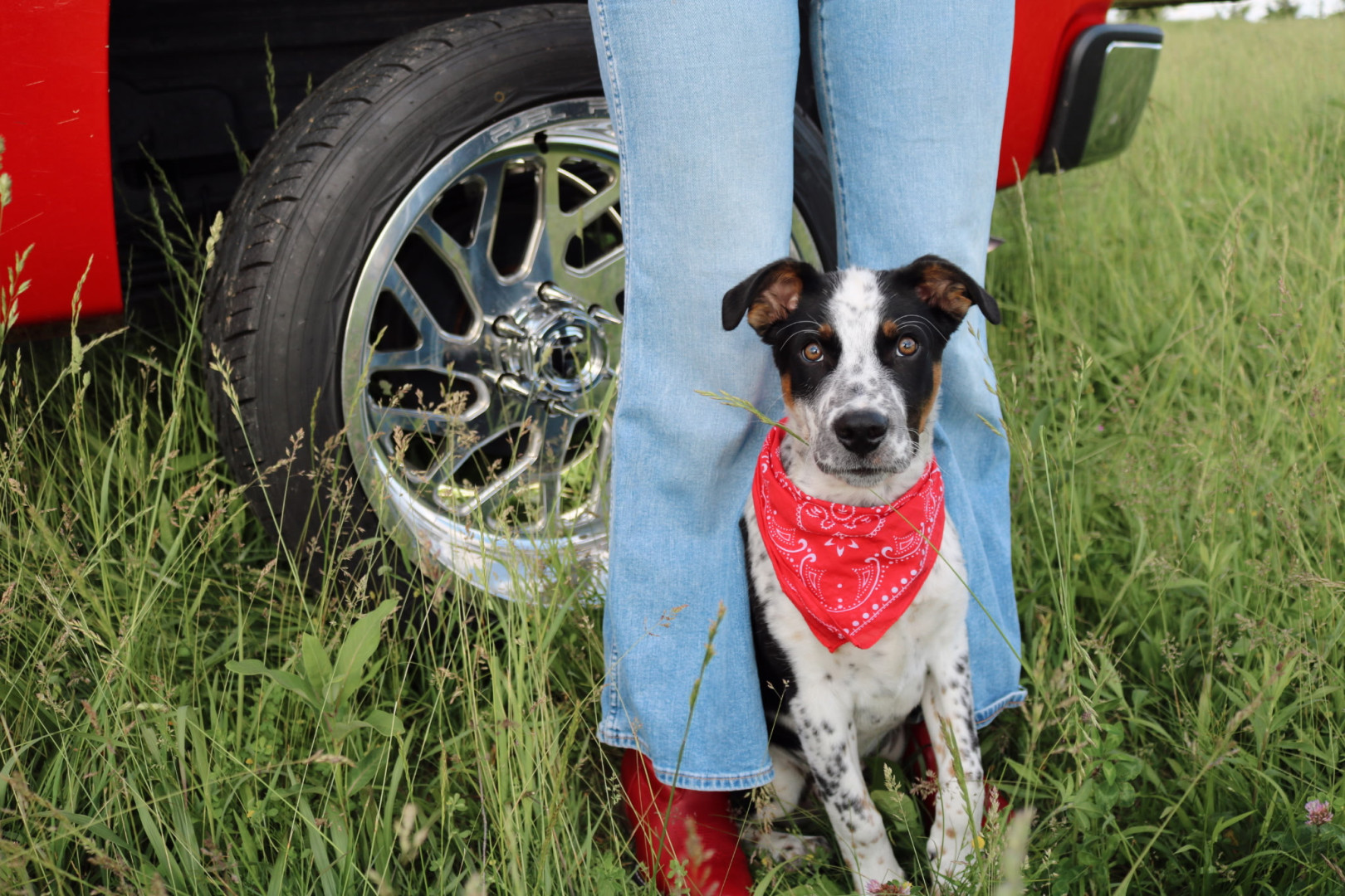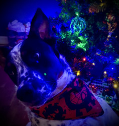 A true American dog River got his name from our love of boating & he enjoys going too. He’s always up for a ride in his dad‘s big red Chevy Silverado sporting his carhart jacket or bandanna. He’s a great protector and cattle herder. With the heart of a warrior, showing courage & no fear he checks the grounds. We know he’d lay his life down for us all. While on nursing home visits he shows empathy and love with his hugs & piecing brown eyes.