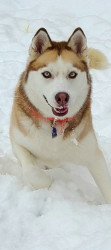 River is a red and white siberian husky . Two blue eyes and loves the snow.