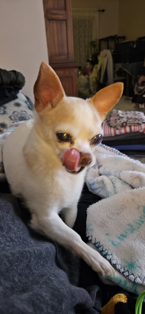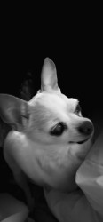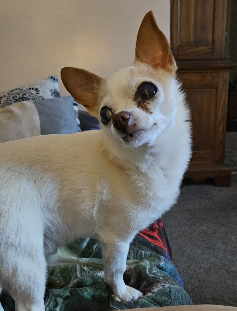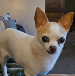 13 year old Chihuahua. He is mostly blind from Glaucoma in one eye and cataract in the other. He likes to sleep at least 18 hours a day!