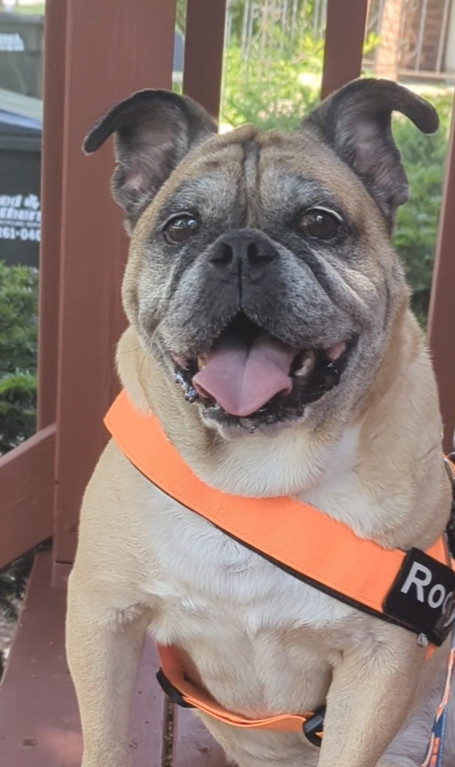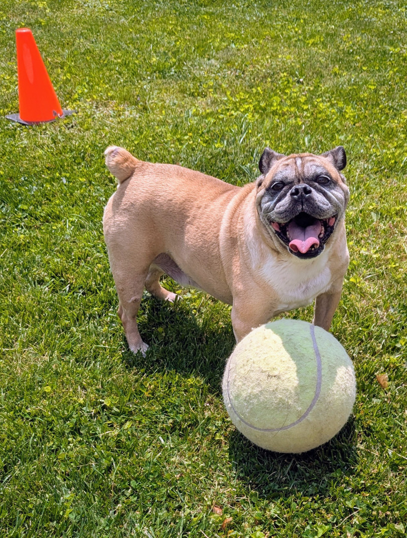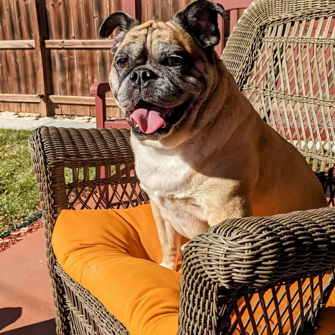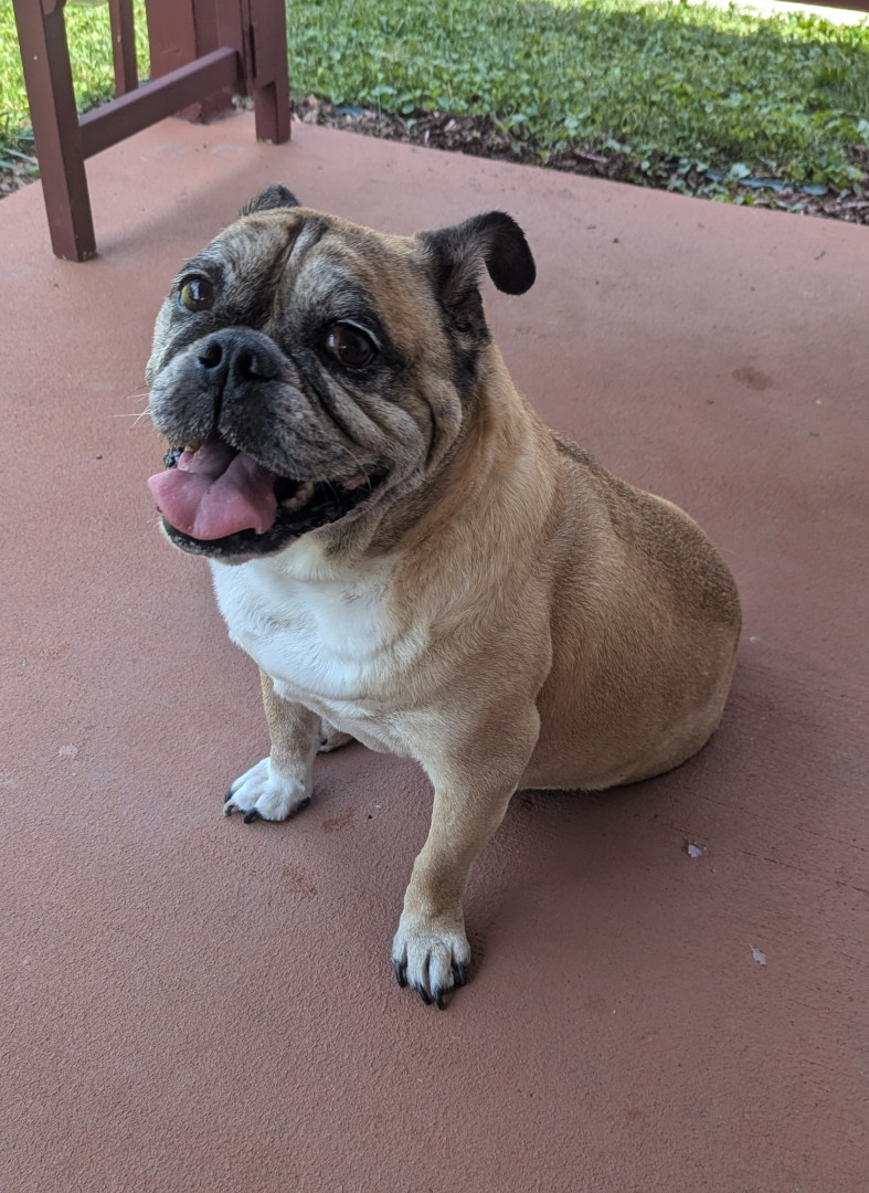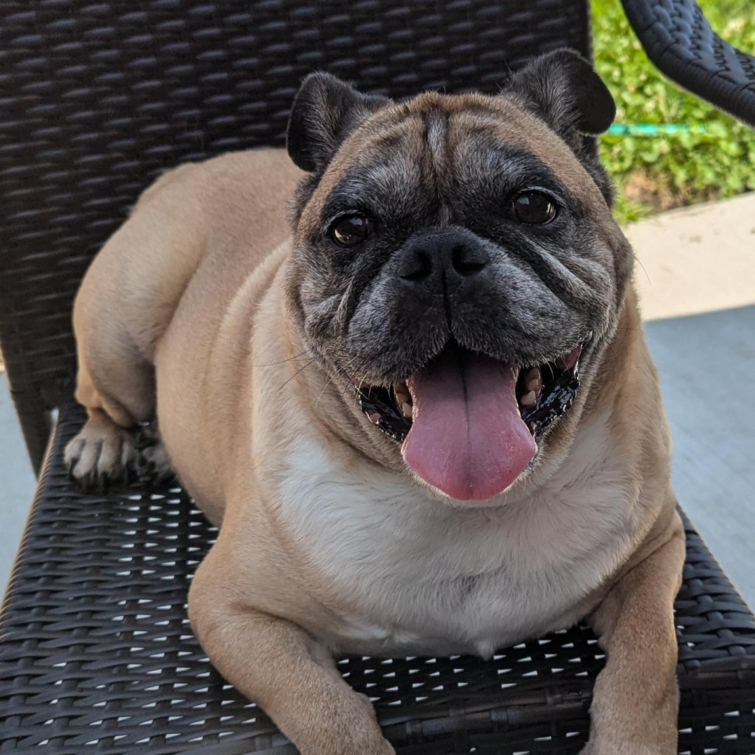 Loving, loyal, funny, and stubborn. Gray in the face, thick in the waist. Hybrid 1/2 English Bulldog, 1/2 Pug. 11 years young ❤️