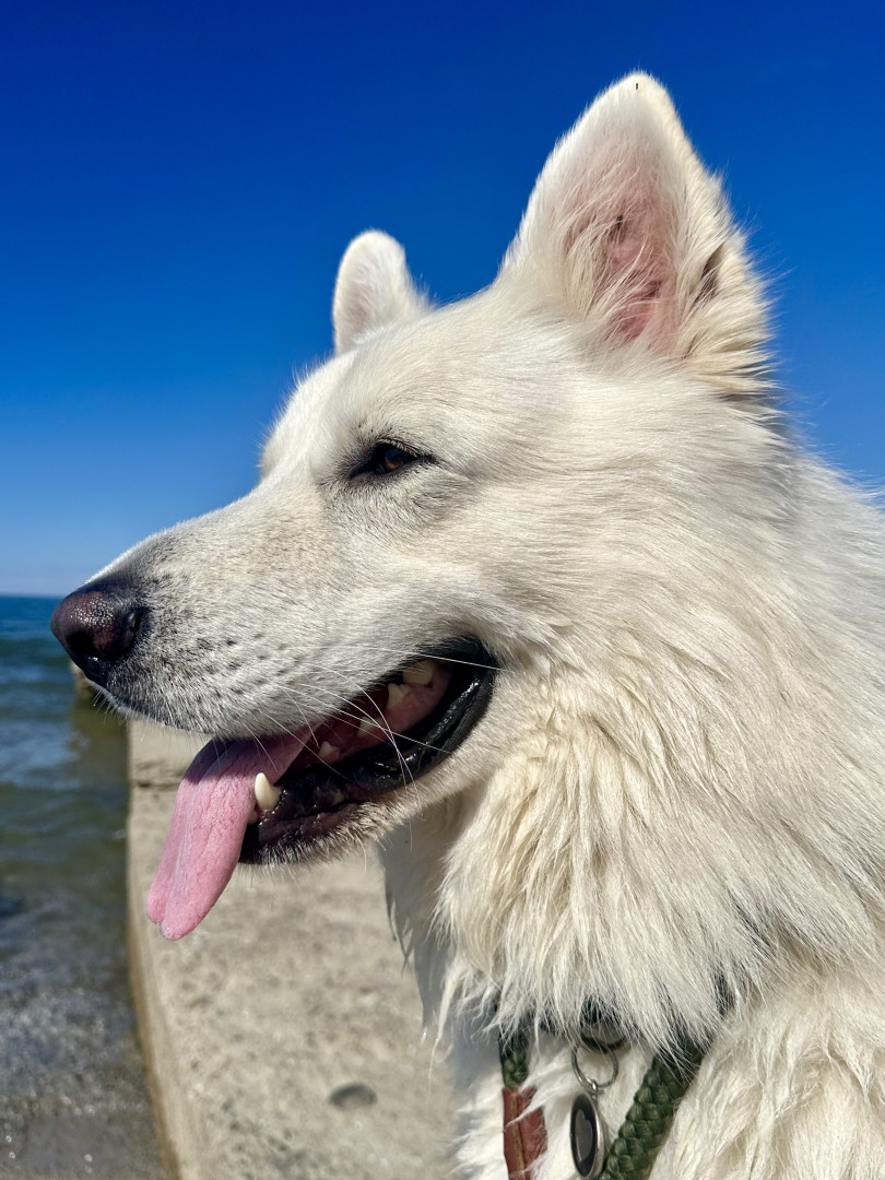 He is a pure white German Shepherd. He is so sweet and is it great loyal protective dog