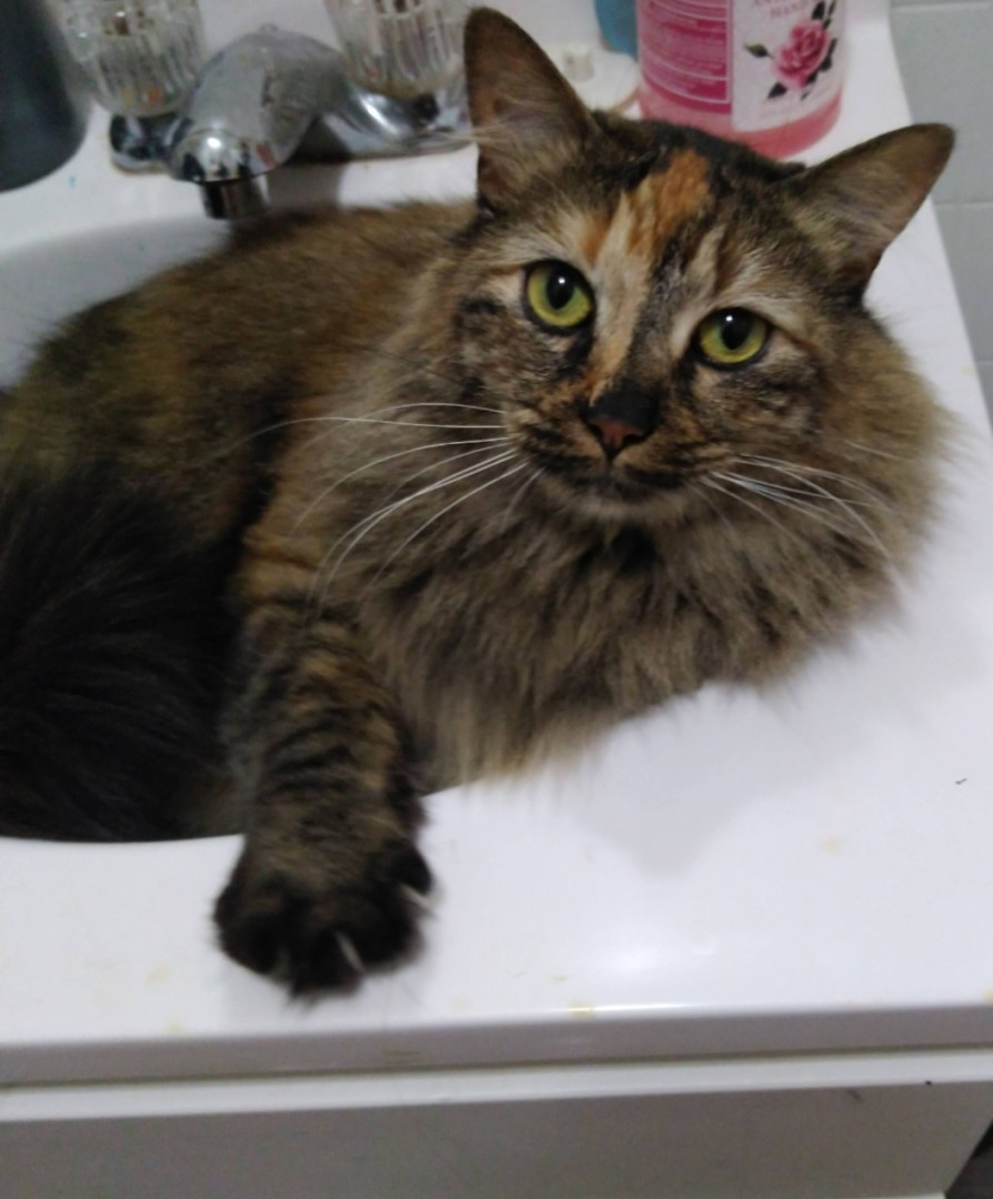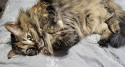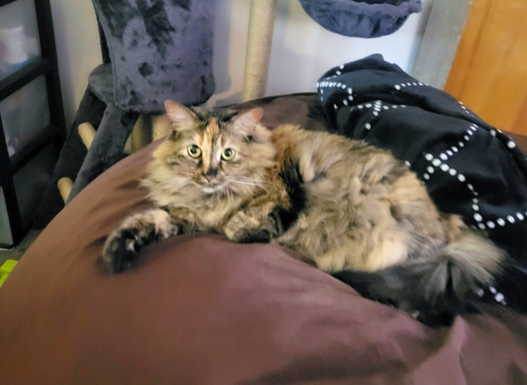 She is absolutely beautiful inside and out! She is a long haired tortoise shell calico with gorgeous green eyes. Rollo is a lone wolf when it comes to her feline siblings. She's not aggressive, but doesn't care to be around them. She can be quite sassy. However, she loves people! Whether it be her family or company. She will stop her beauty rest to see who's visiting.