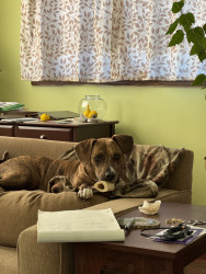 I’ll have to say her gorgeous brindle coat with the spots of white, especially her tiny “socks” on her paws