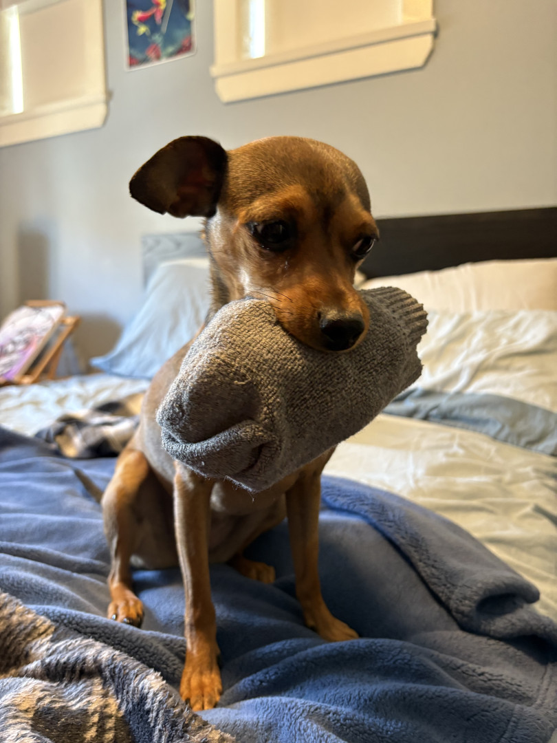 Roo’s favourite toys are our socks…. She hunts for them and runs around joyously when she snatches them from the fresh laundry or off of our feet. Her favourite treats have peanut butter in them