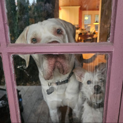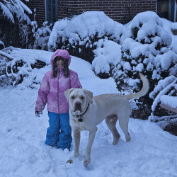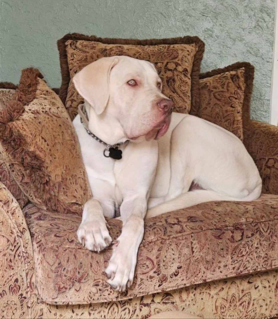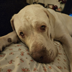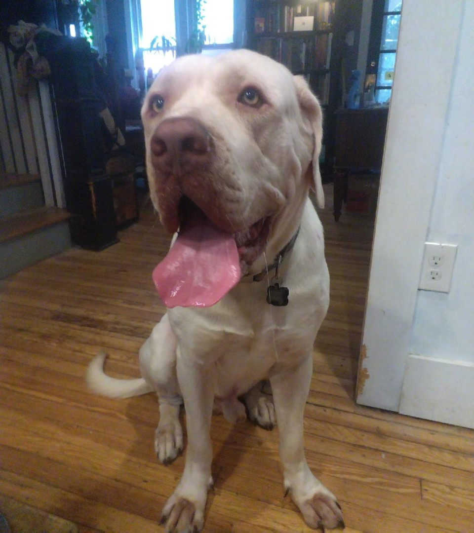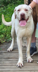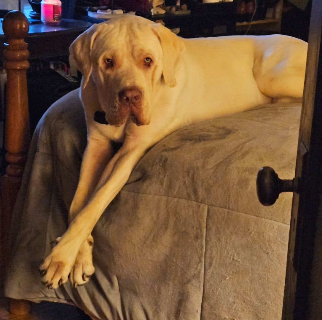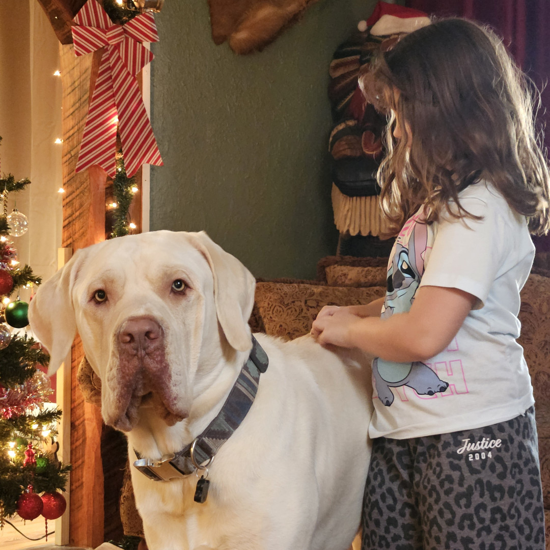 He is a 150 lb white mastador.Taking him anywhere is like going somewhere with a celebrity. He is a true gentle giant. He is a people magnet