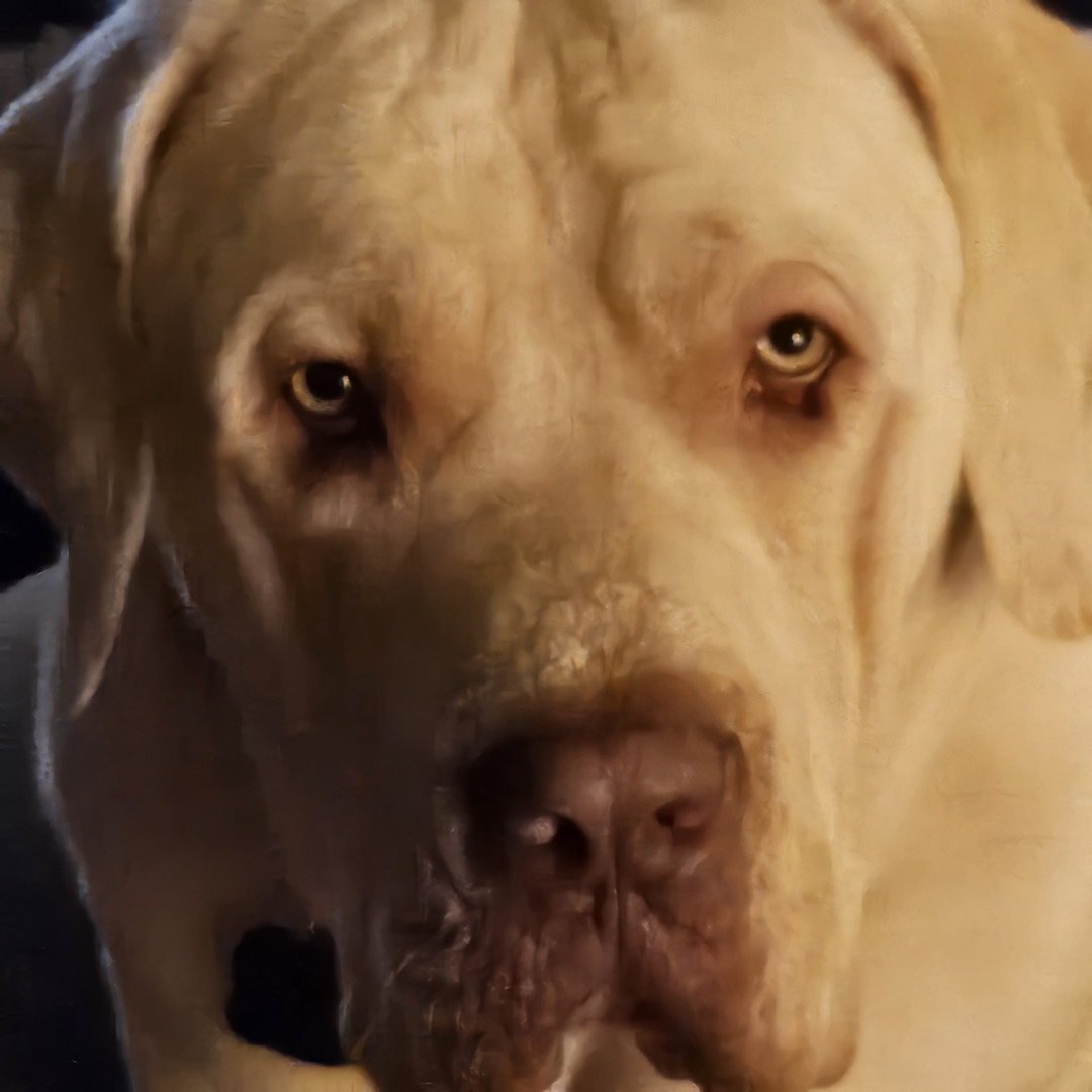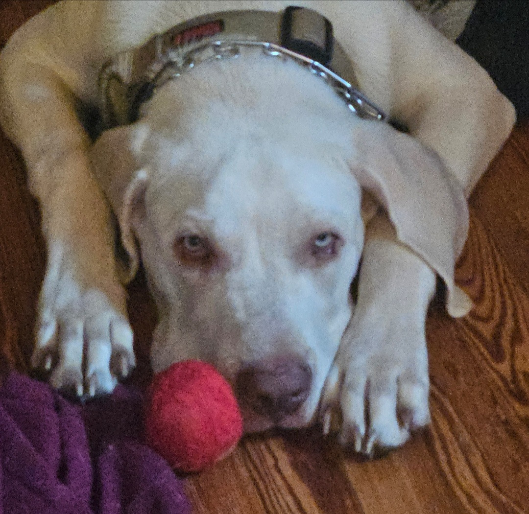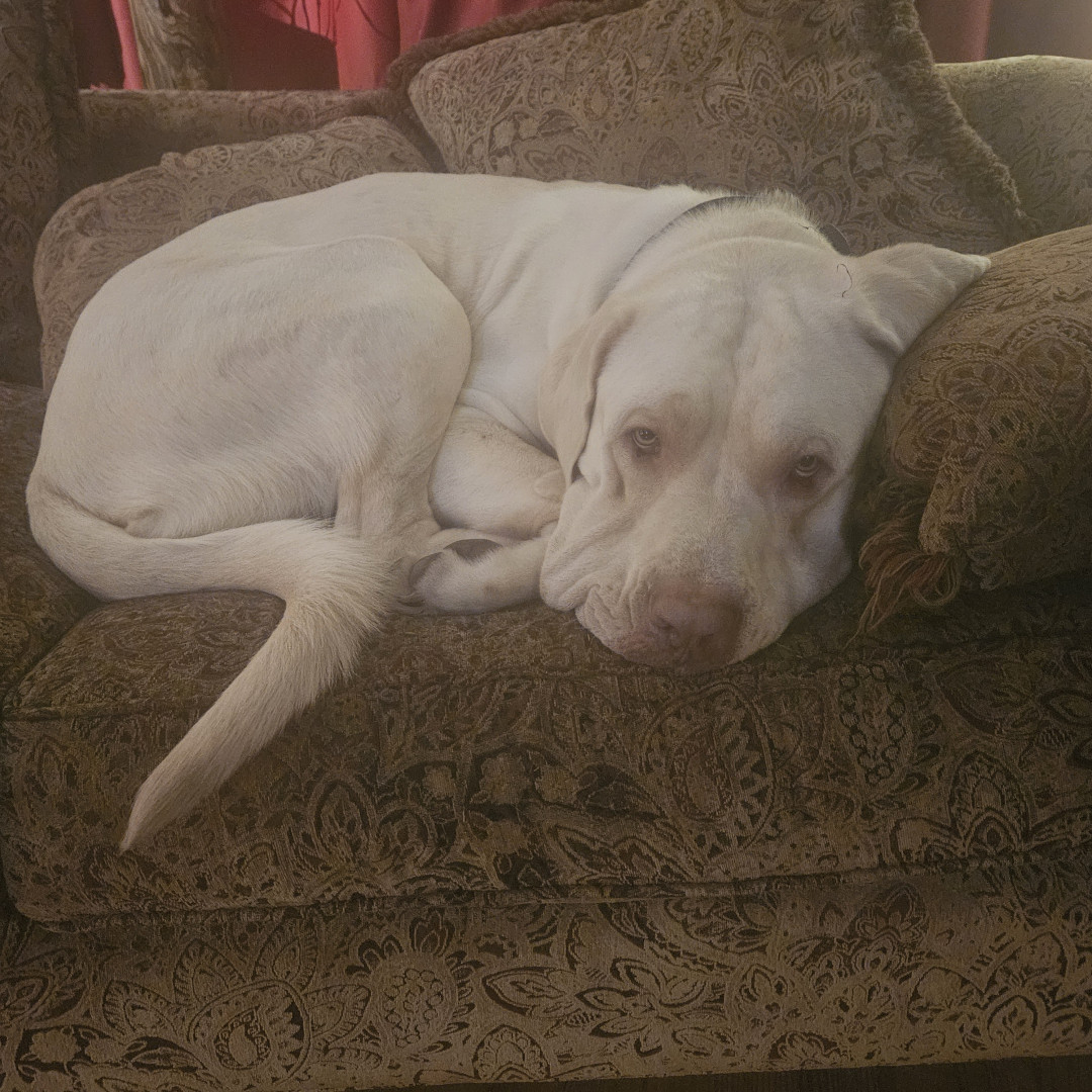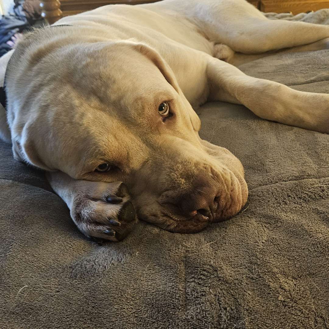 He is a 150 lb white mastador.Taking him anywhere is like going somewhere with a celebrity. He is a true gentle giant. He is a people magnet