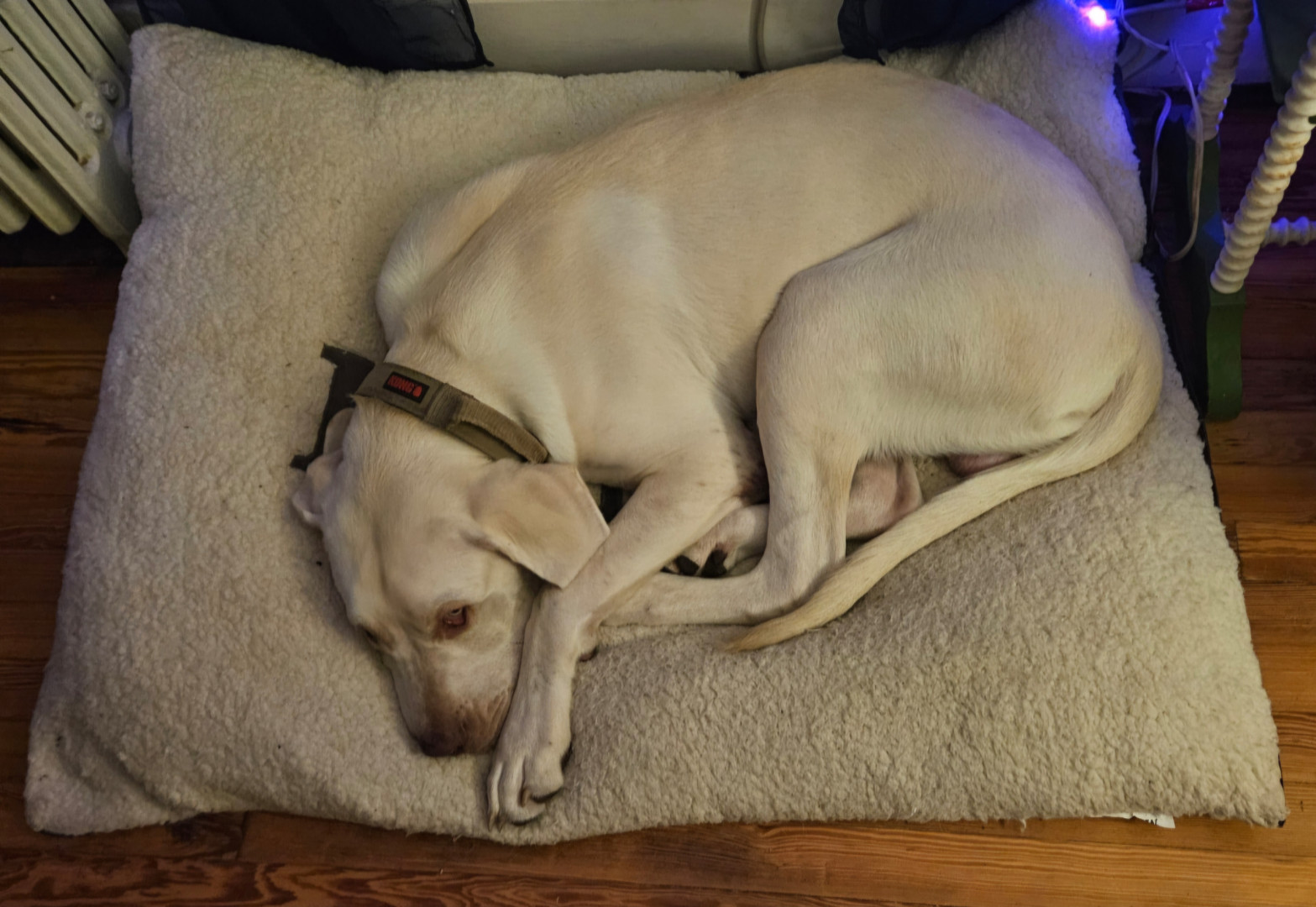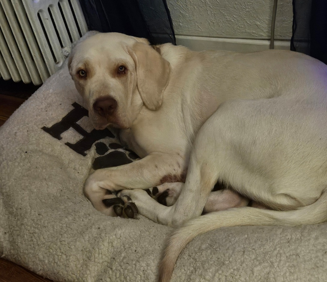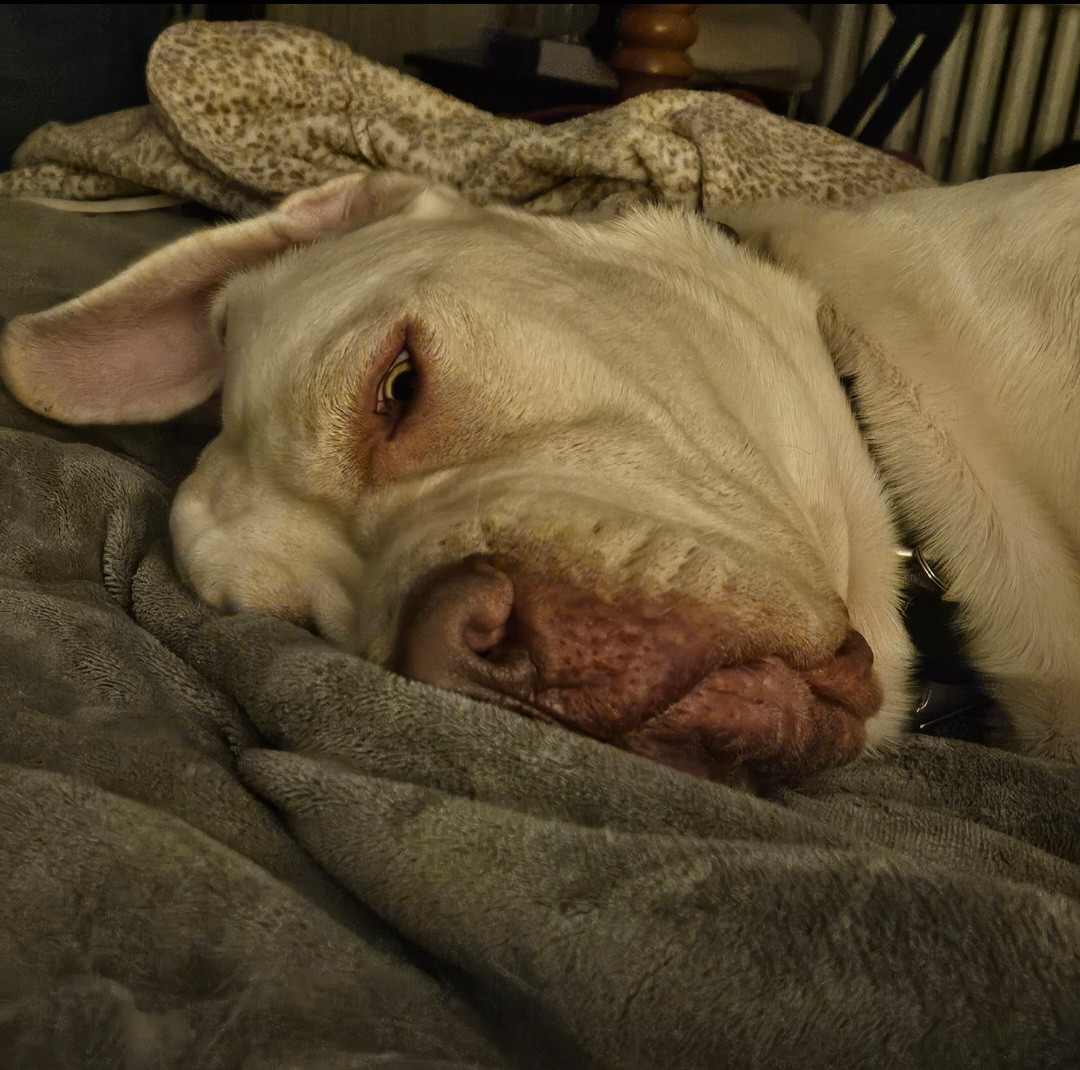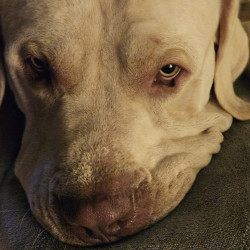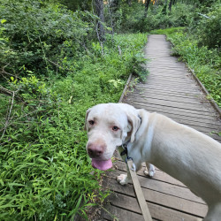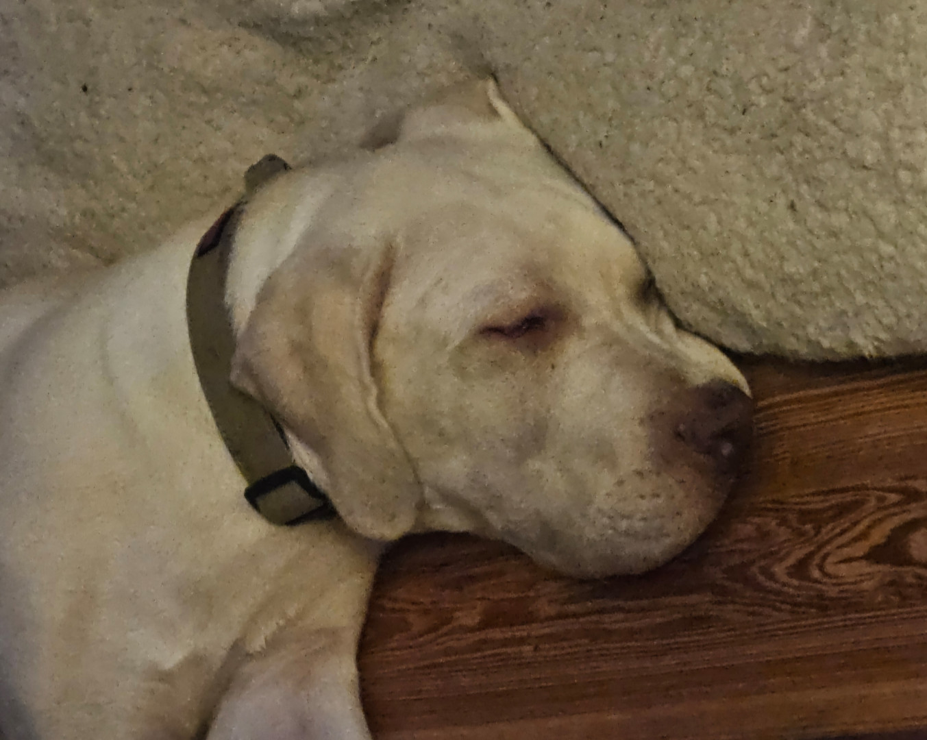 He is a 150 lb white mastador.Taking him anywhere is like going somewhere with a celebrity. He is a true gentle giant. He is a people magnet