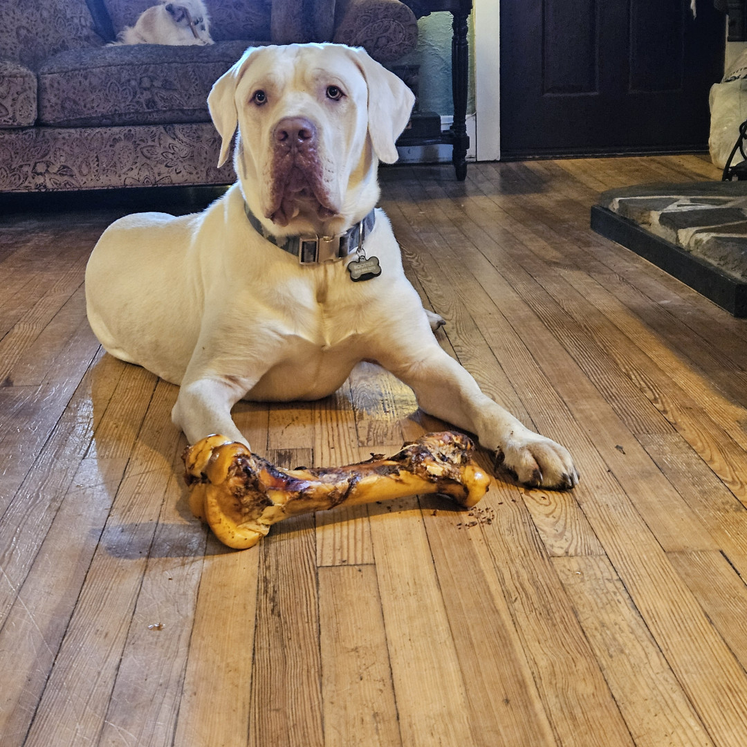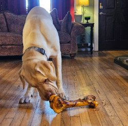 Rooster is a giant, his favorite toy is a ring that he chews on. It's the only thing he has nibbled to bits. He loves his biscuits..lol. Milk bones are his favorite biscuits. He will let you know he wants one. And gladly shake his massive paw with you for one.