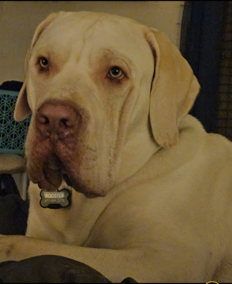 Rooster came to us from Minnesota, Beiber Mastadors. We picked out a name before he even got to us. I knew he would be a big dog, he needed a big name. "ROOSTER" after Rooster Cogburn (John Wayne). He needed a special name to go with his uniqueness. I didn't want to call him Joh Wayne..lol. So, fter a great character it was. He is just the sweetest giant dog that anybody could want. He walks so calmly down the stairs with my 9 yr old daughter as if guiding her up and down the stairs.