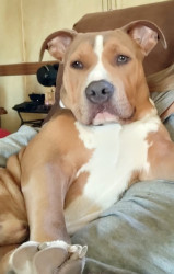 Pulls rope, Chase balls play with all my other dogs, stays by my side when I get up. Love's to go bye bye. Go to dairy Queen in get a thing of ice cream.