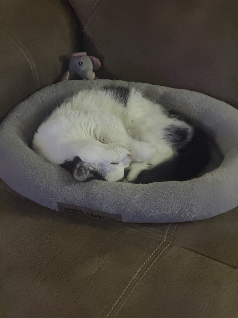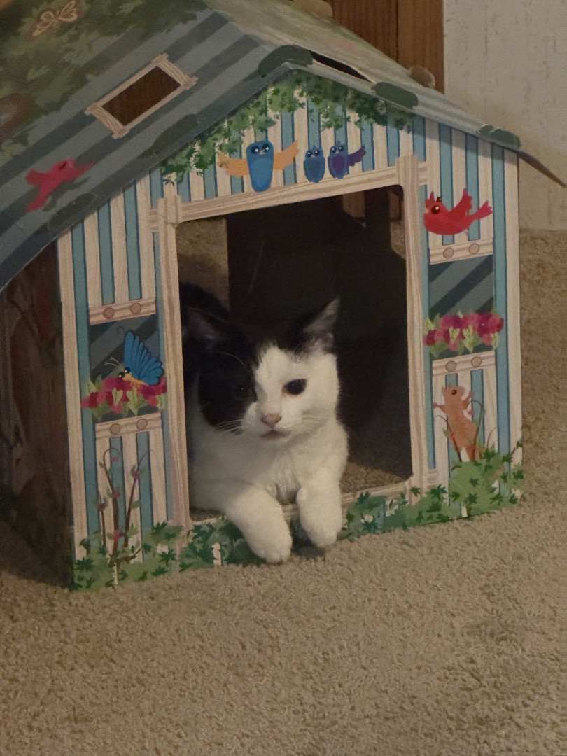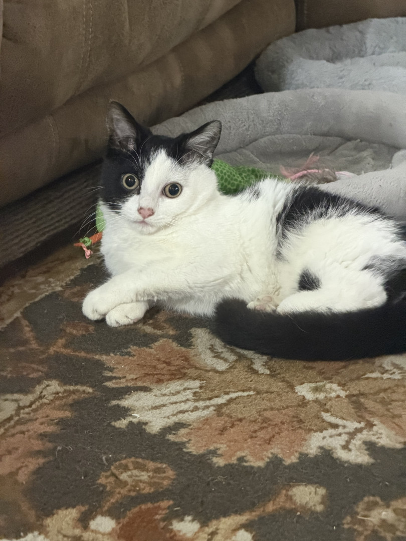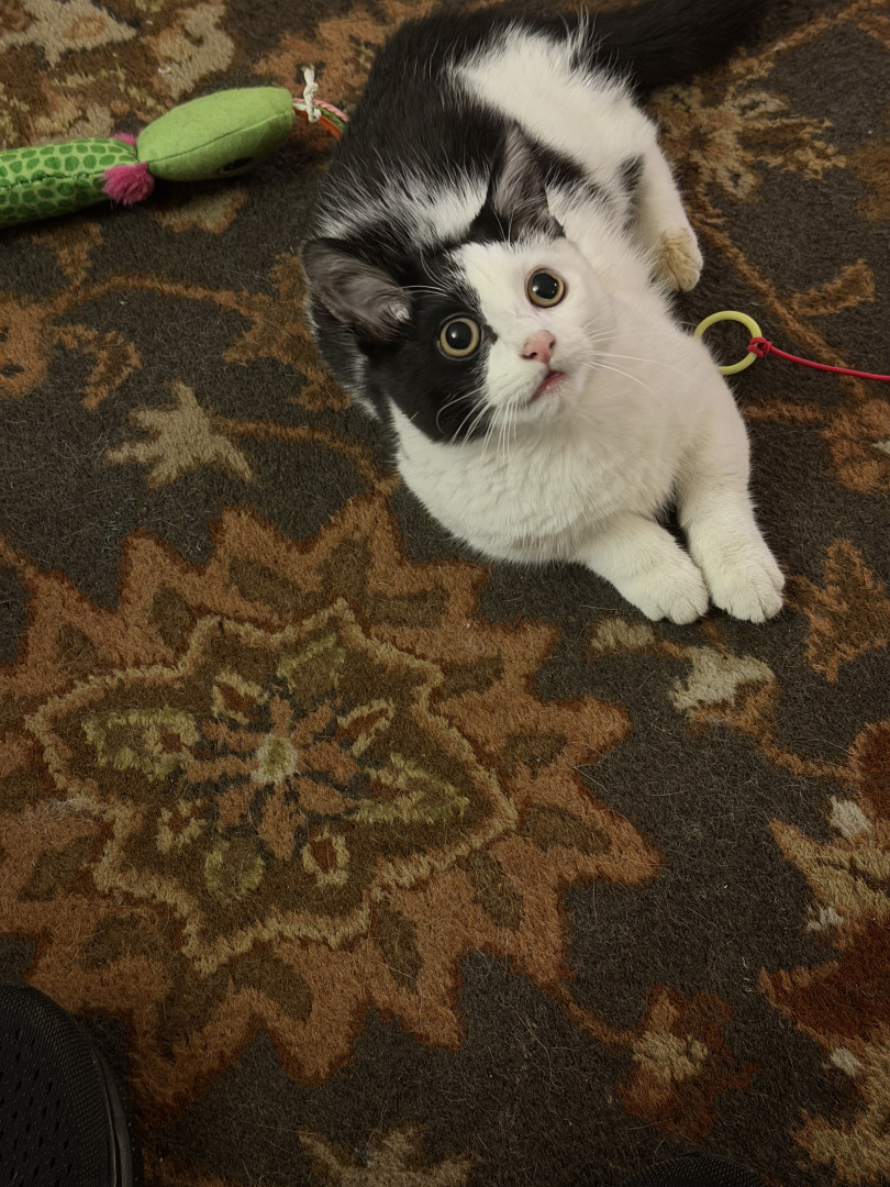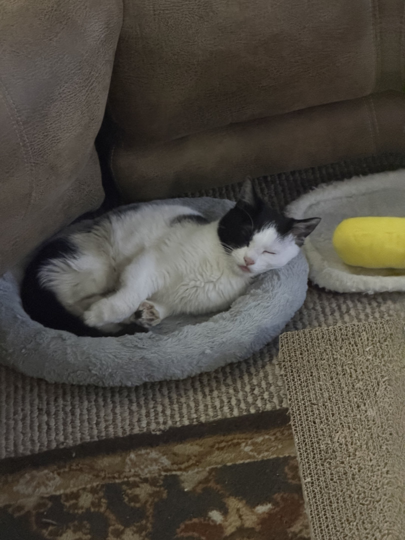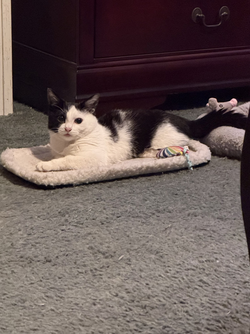 He was a 2 week old kitten I found with deformed bones and a bunch of problems and now he is a thriving almost 8 month old. Mommas Miracle.