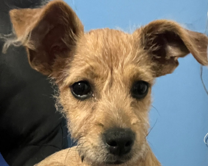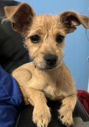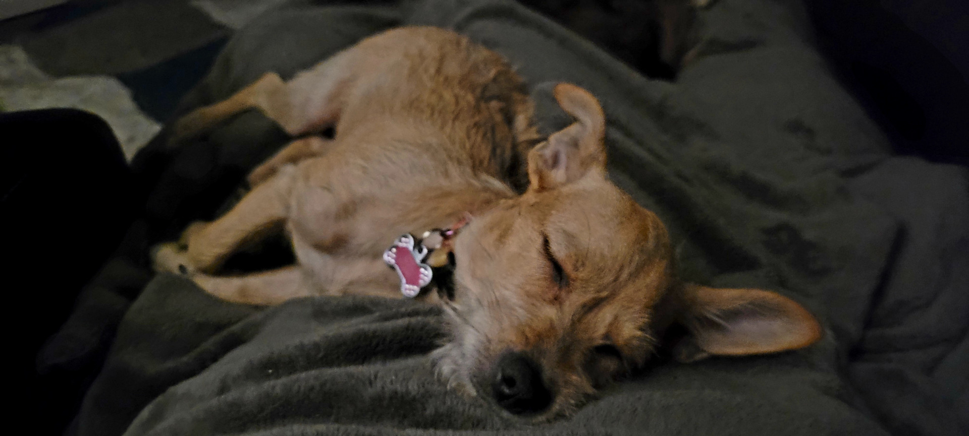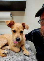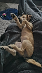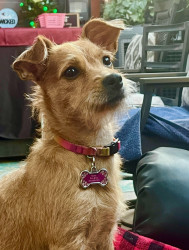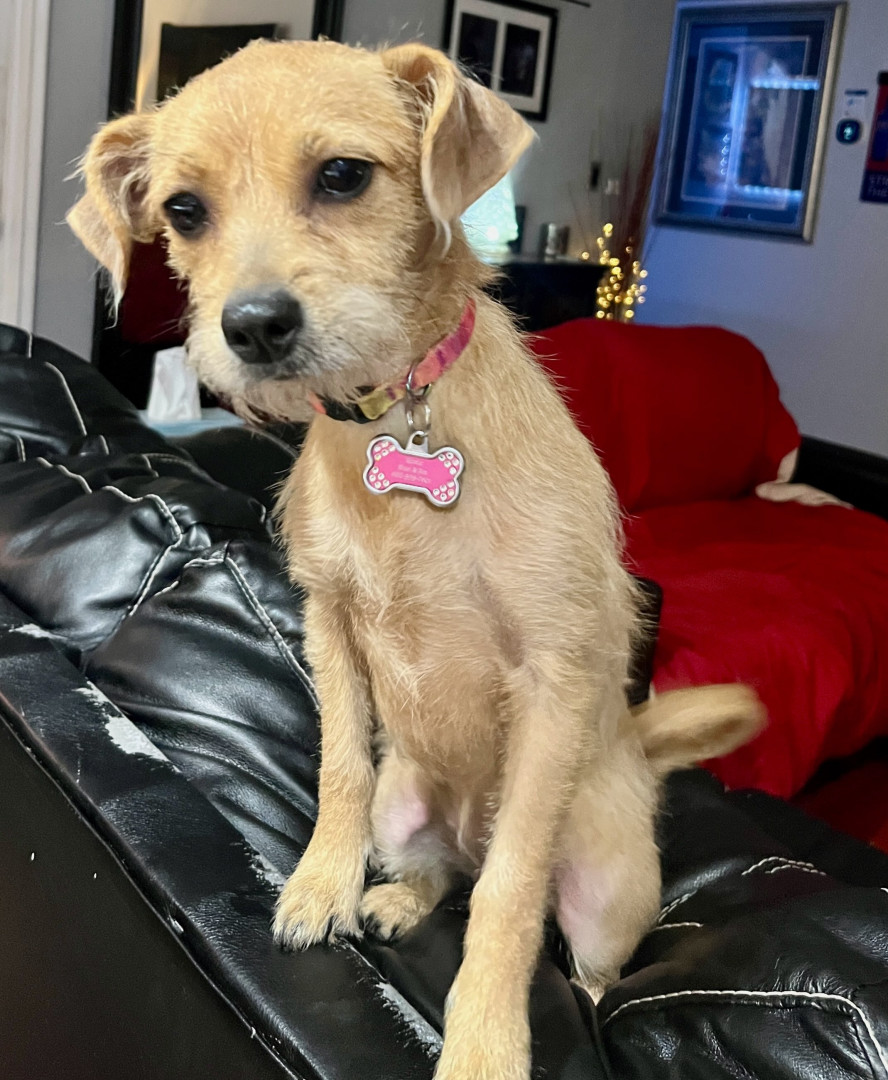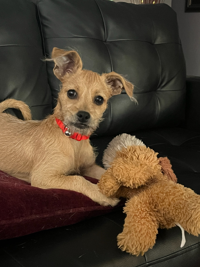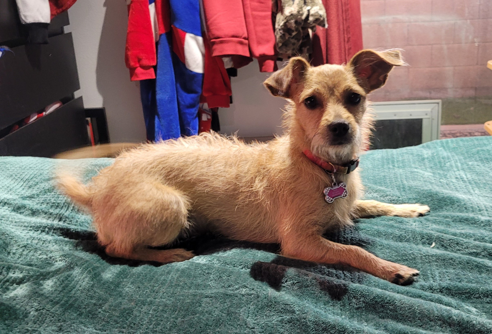 She was abandoned in May in a dog carrier bag by Tempe Town Lake. Considering that trauma, she is very sweet and has a much better life now. She has a great playful personality and loves to play with her two brothers. She also arrived at the perfect time as I lost my 16 year old terrier mix Max in October.
