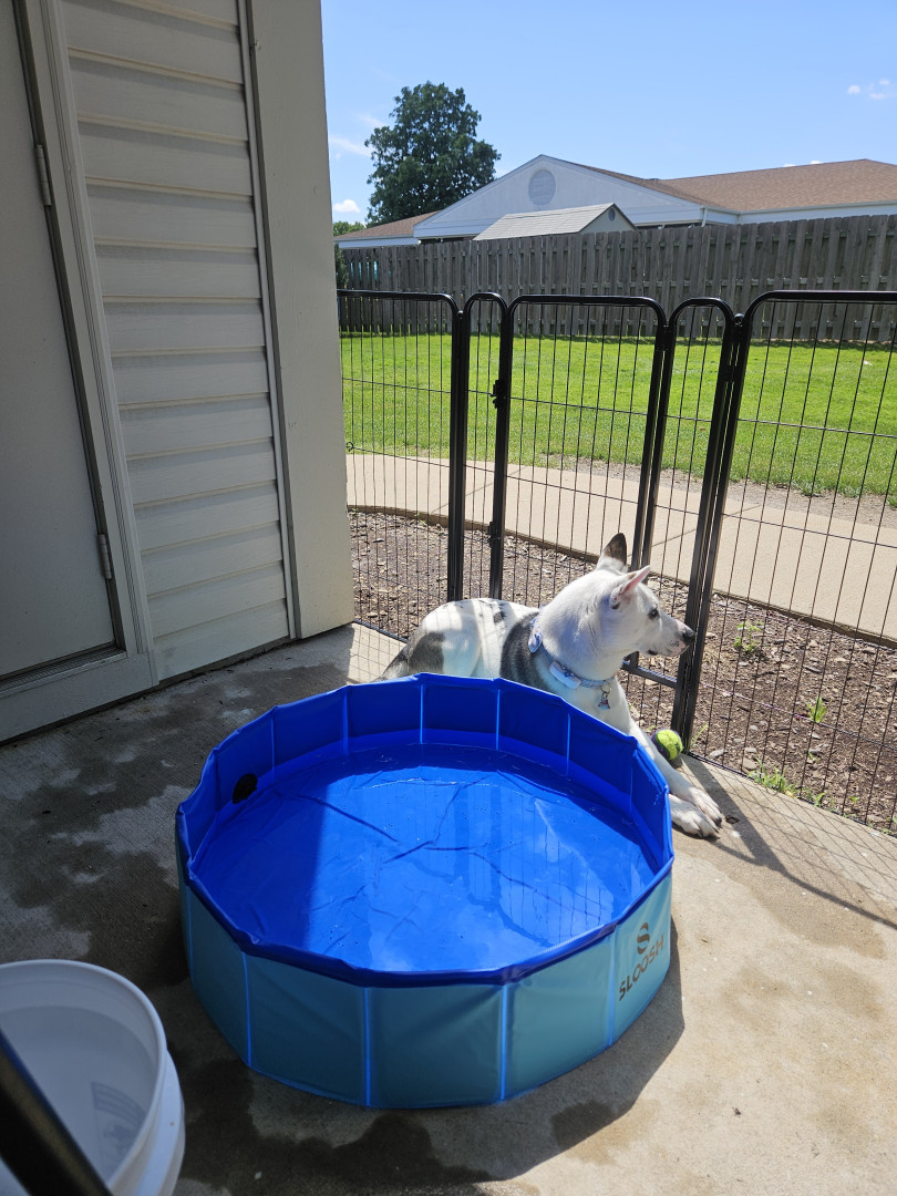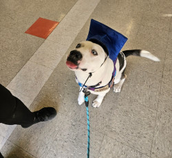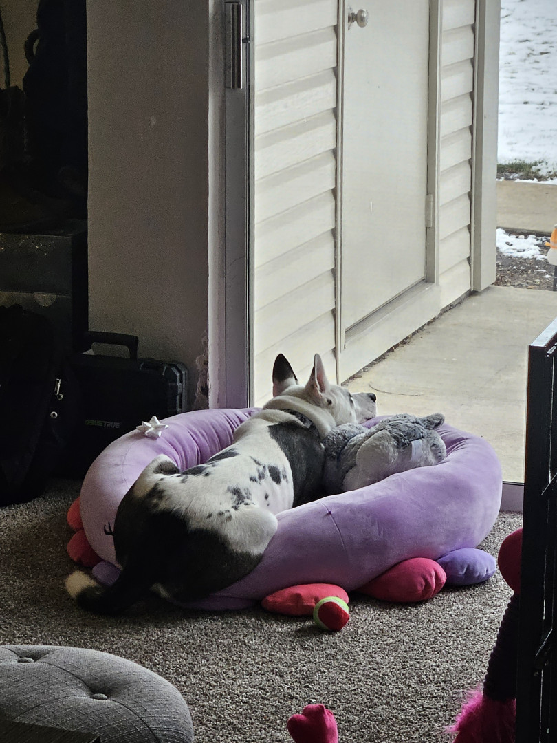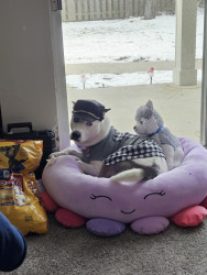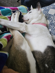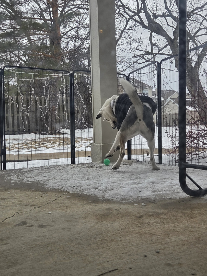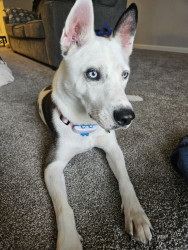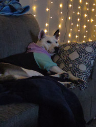 She is a sweet rescue that had a hard life. She is a very loving and funny girl. Rosie loves everyone and is always running to the next person for scratches. When Rosie gets excited she will hop around the house like a bunny rabbit, and will zoom all around. Rosie loves to play fetch, and when someone can't throw the ball for her she has learned to throw it in the air herself so she can chase it.