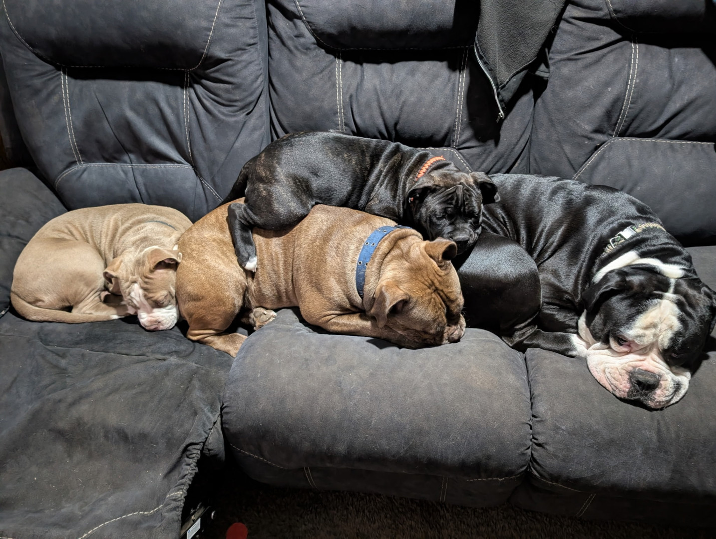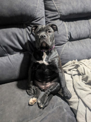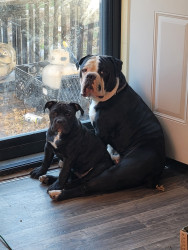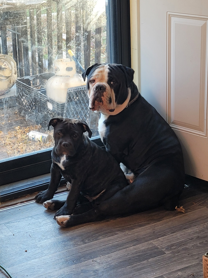 She may be the runt physically but not in anything she does or our hearts. She's a reverse brindle Oldde English Bulldogge.