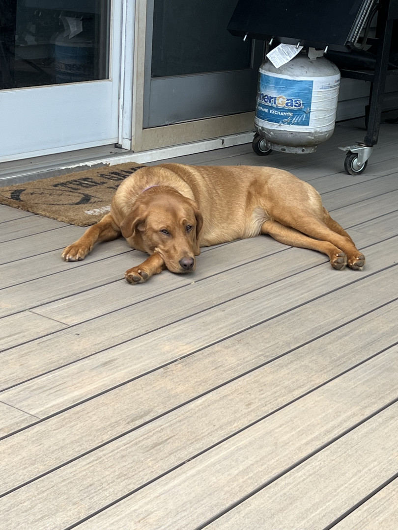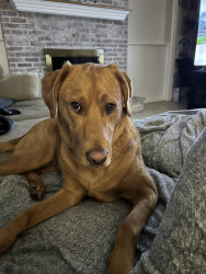 Our red fox lab Ruby Jean is a sweet snuggly dog. She loves to play with her toys from Christmas & lay on our couch watch tv with our family
