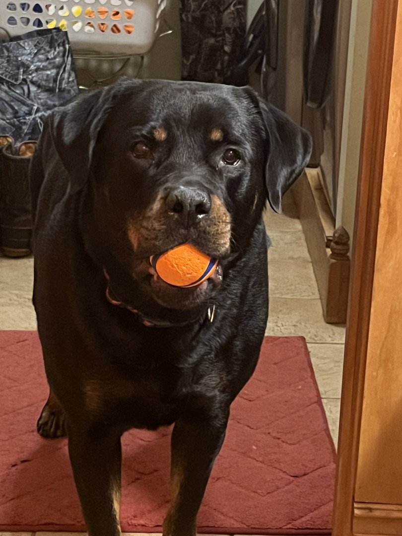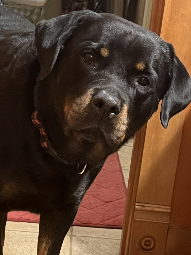 Big heart, loves people, sweetheart, lovable and ferocious! Sweetest face ever! Big girl weighs 135#!