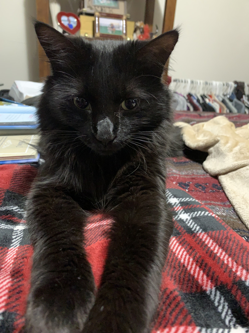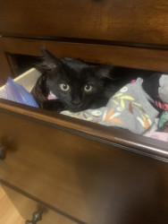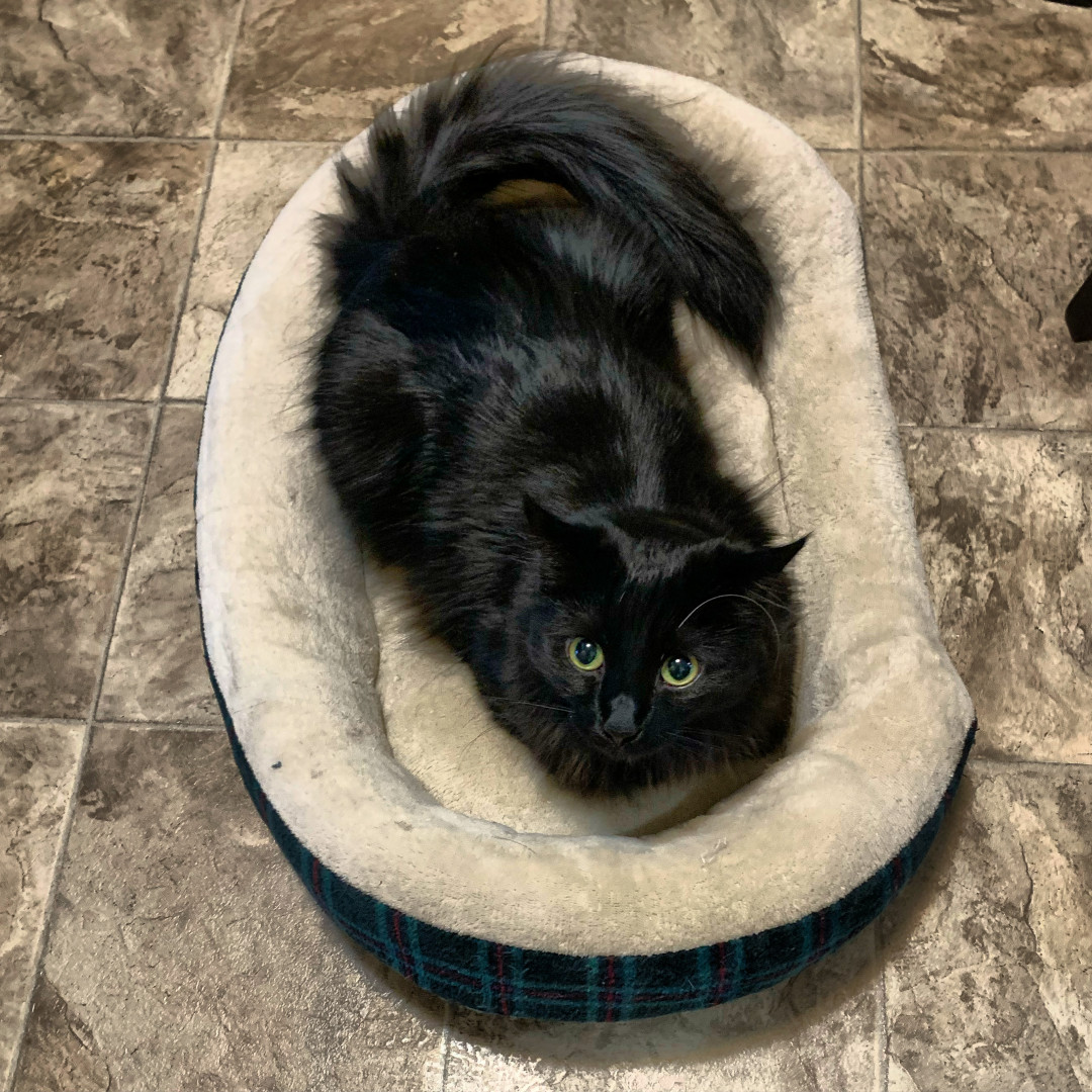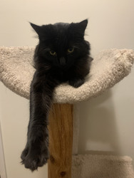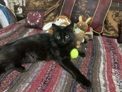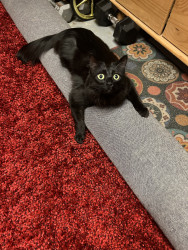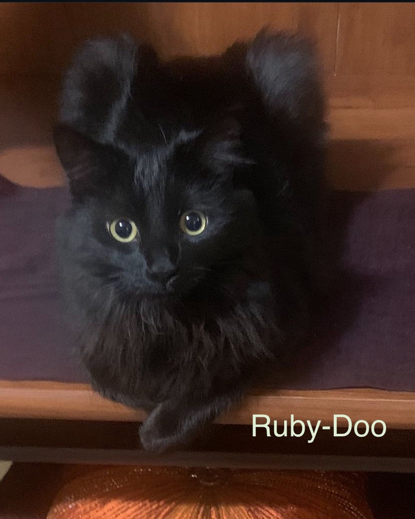 Ruby-Doo is a silky black long-haired cat, full of playful energy, funny quirks, and charm, part mischievous comedian, part elegant diva!