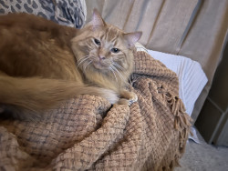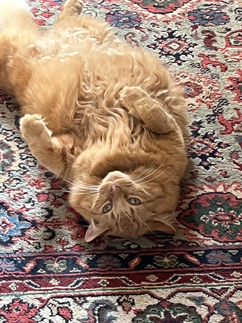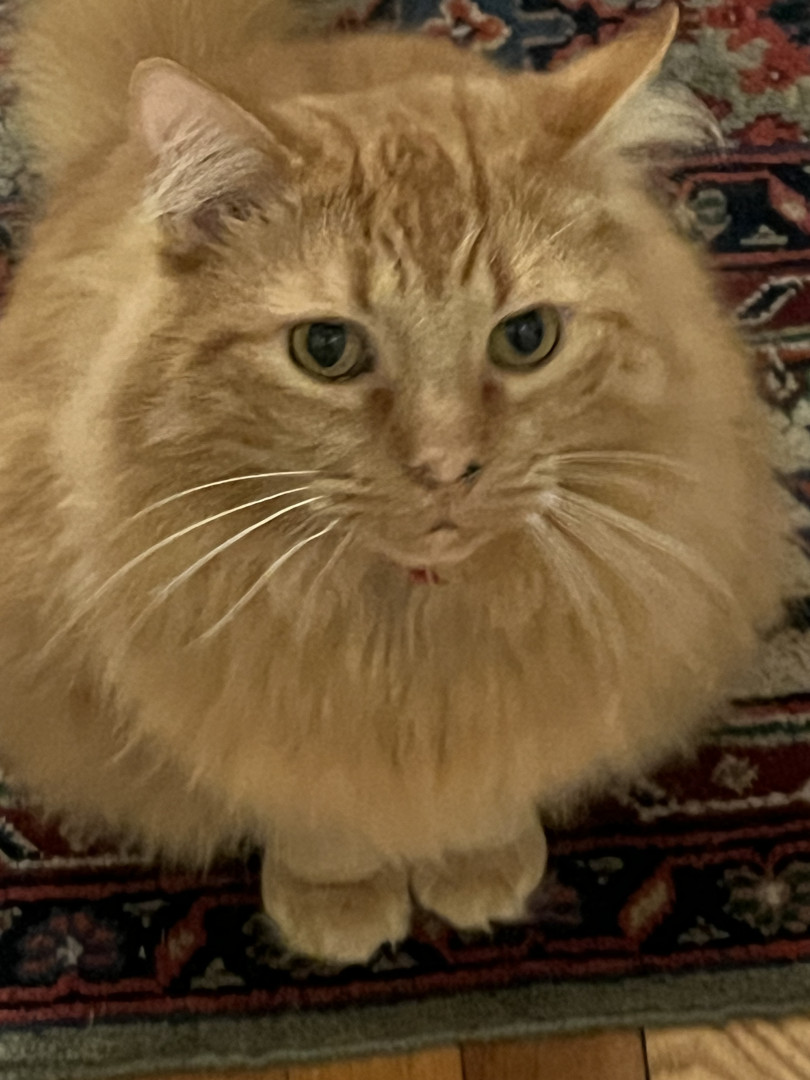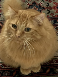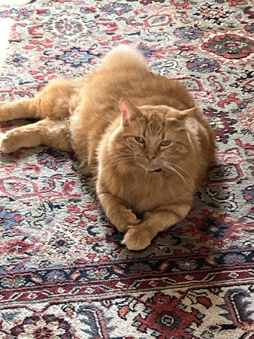 Rudy was a street cat that showed up matted. He turned into a handsome orange pumpkin. He likes to keep the dogs in line and sleep on myhead