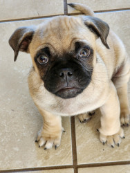 Rudy, a pug-chihuahua with big soulful eyes and velvet ears, is a warm, cuddly mama’s boy who lives for bed snuggles.