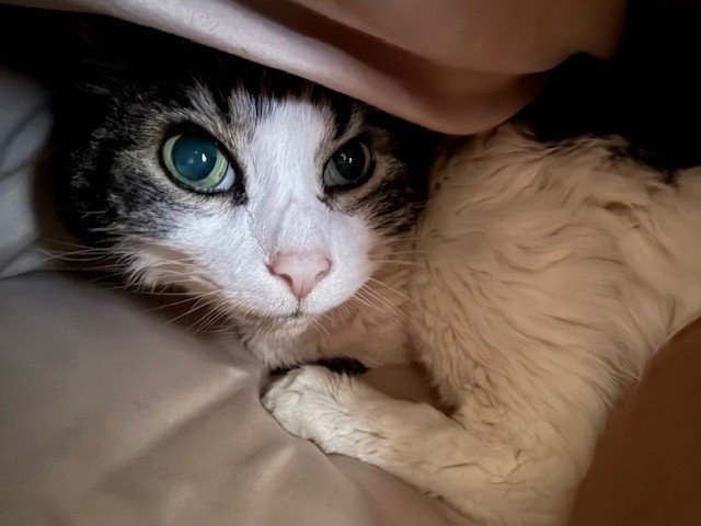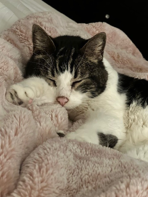 He loves his nighttime routine. Having a snack, jumping up on the bed and getting ready to cuddle and fall asleep while we hold paws. It’s both of us falling asleep with the love we share for each other.