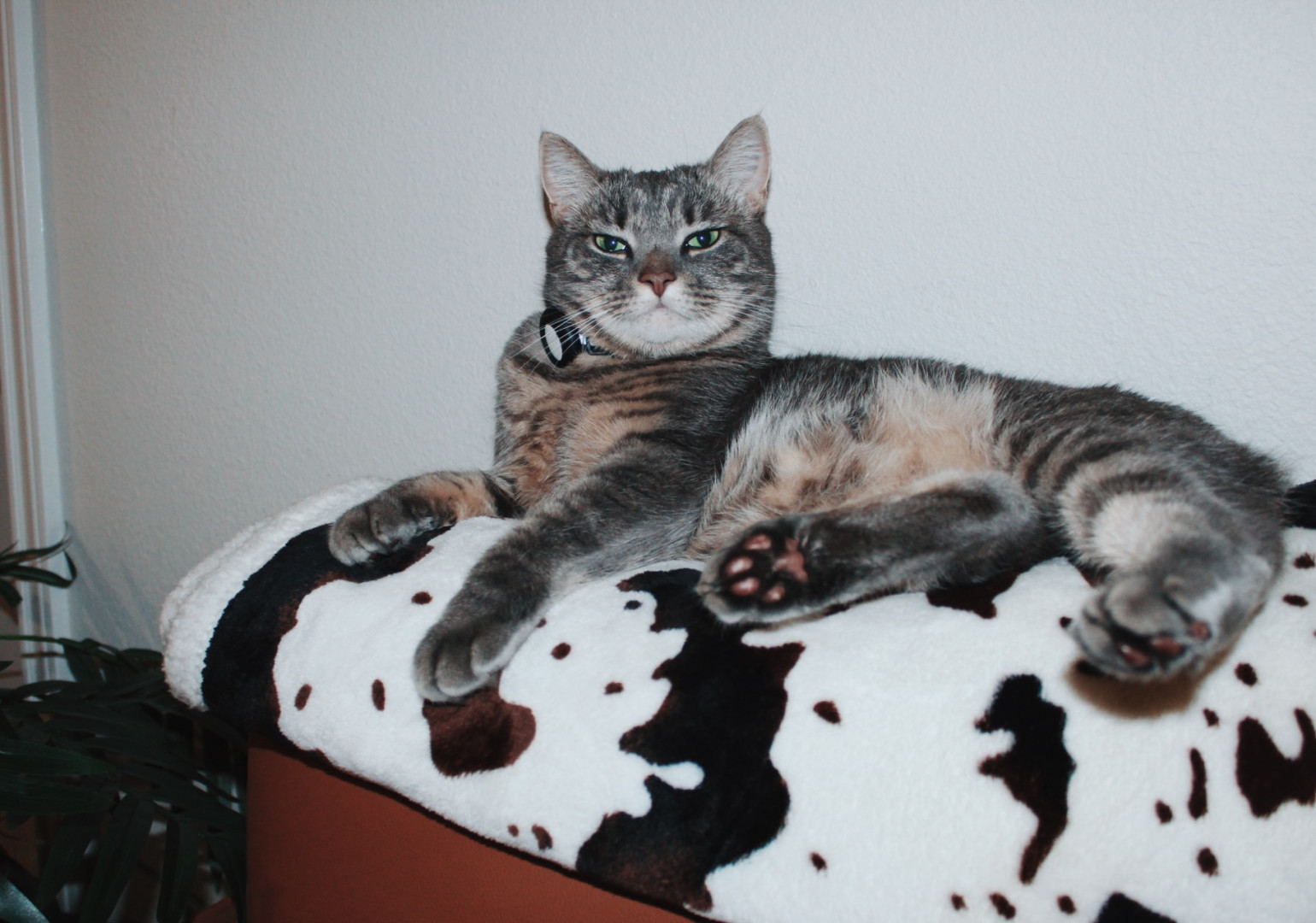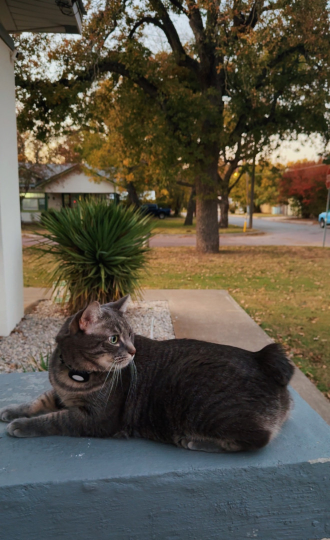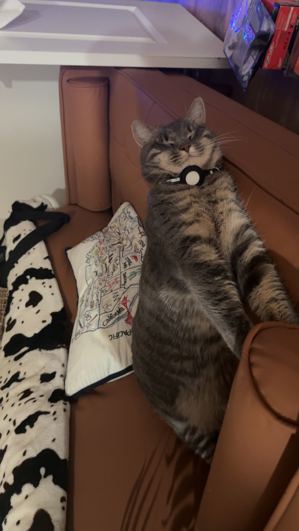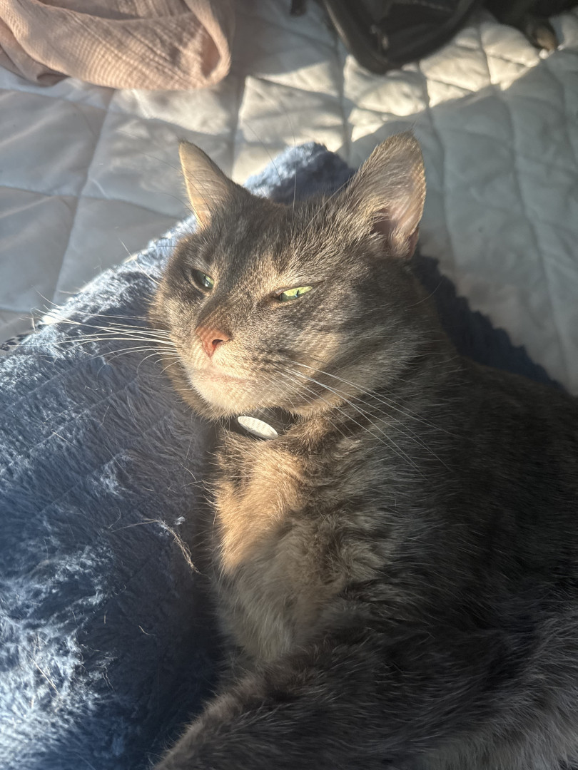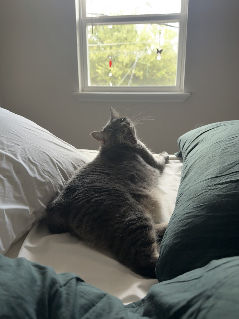 Rue was born with a tiny nub tail and instead of swishing she wiggles her whole body when she’s happy. She’s also one of the rare cats who loves belly rubs and will flop dramatically for them while still giving full-on diva attitude.
