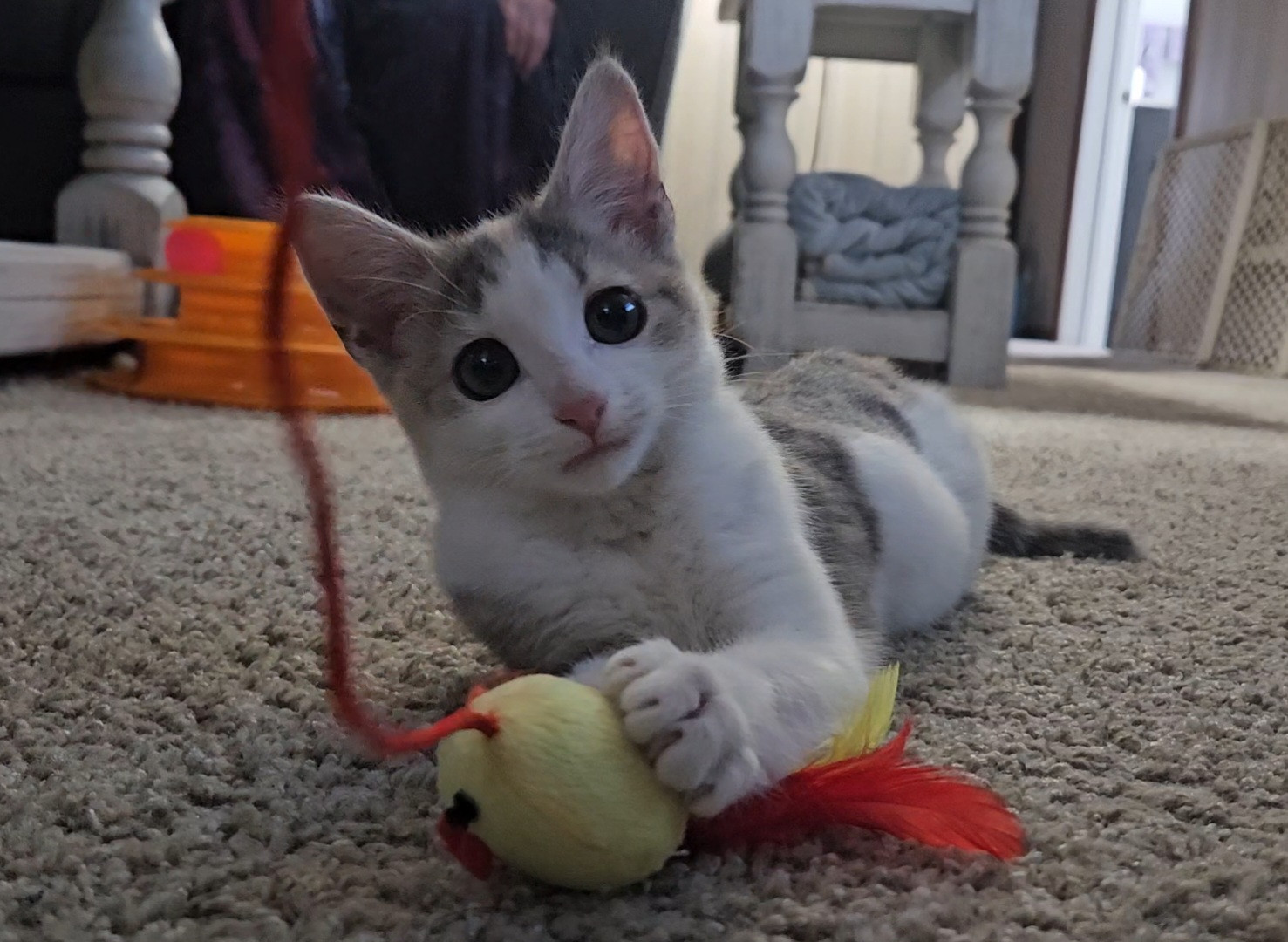 She loves fuzzy catnip mice toys and her ball tower. She'll sit for an hour and play with it.