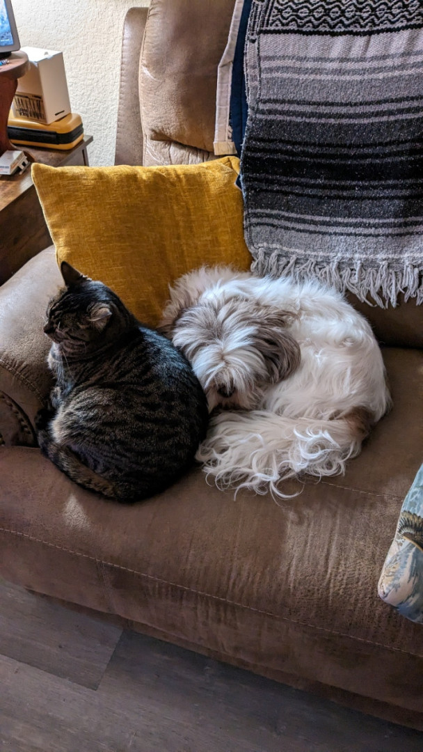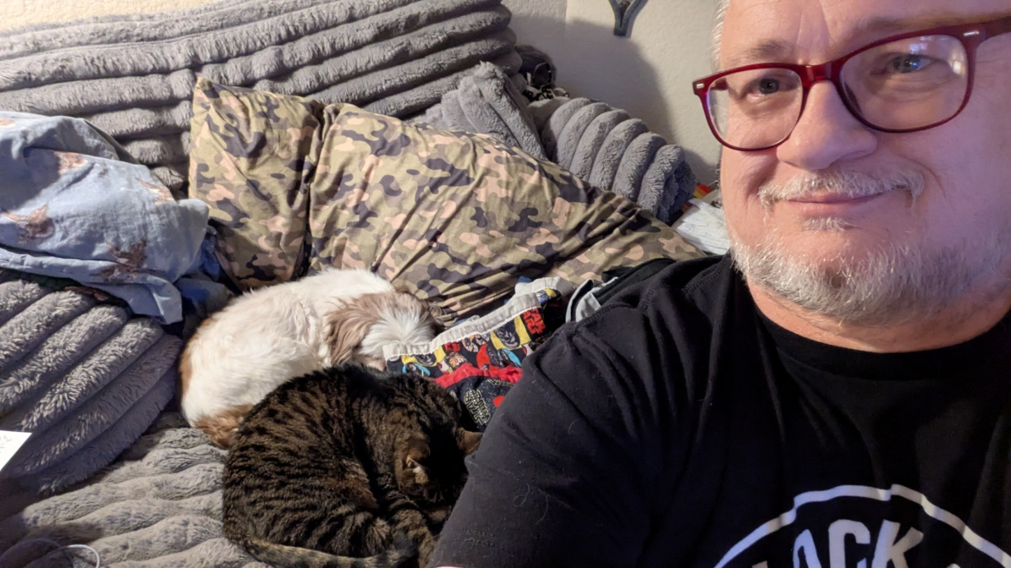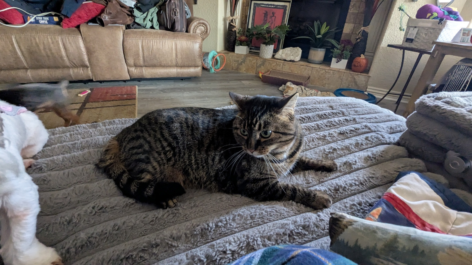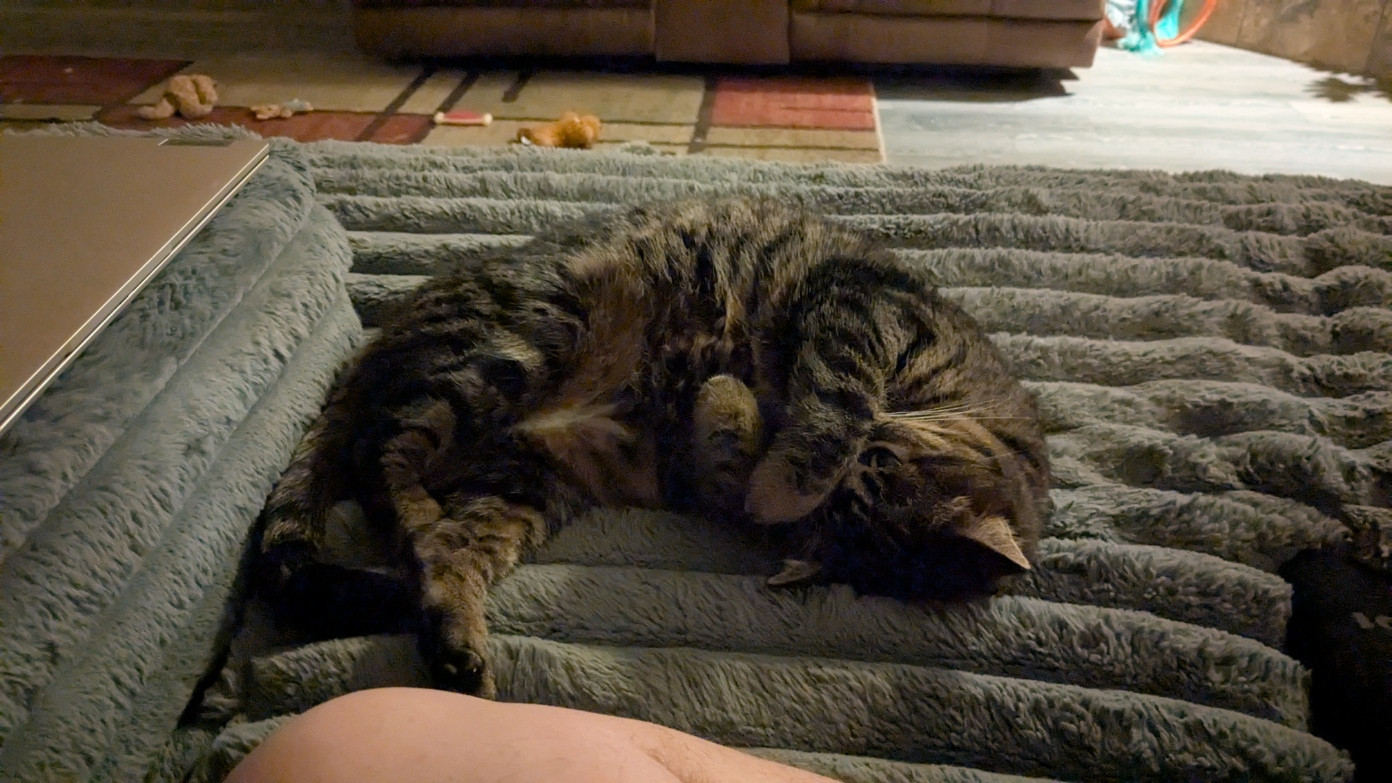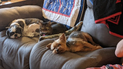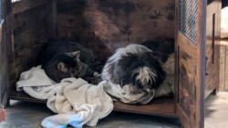What stands out most is how deeply she cares for our other pets. We recently lost two senior dogs, and she always seemed to sense when they weren’t feeling well or slowing down. She would quietly snuggle beside them or keep watch nearby. One photo captures this perfectly: our late dog Walter asleep in his bed, unwell, while she lay next to him, careful not to wake him, reaching out with the gentlest touch. Every night at bedtime, she crates herself, choosing to sleep right beside Buddy.