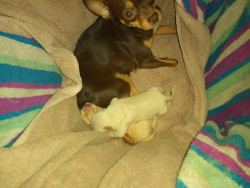 She is a beautiful Reese's color with the larger Chihuahua ears. She is spunky and happy. She just had two babies but she is still the s