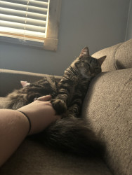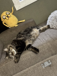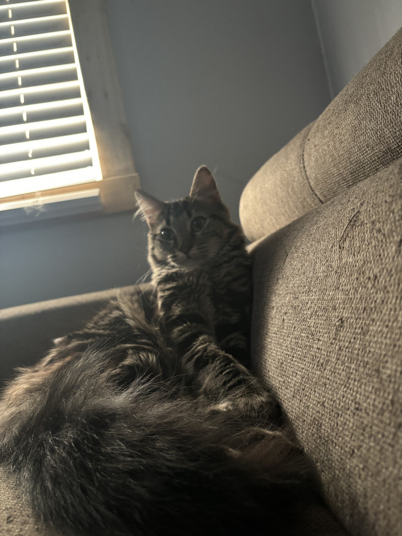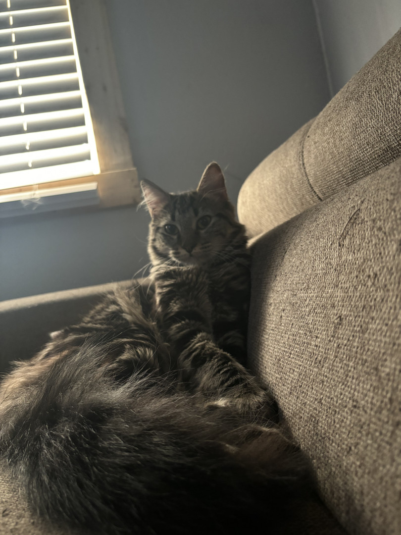 Sage is a bird watching addict and loves to talk to the tv when birds are on. She has her own sassy personality and sways her fluffy tail.