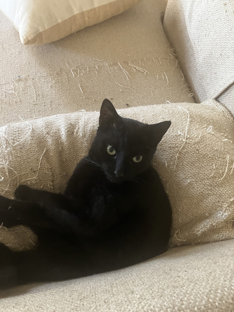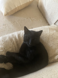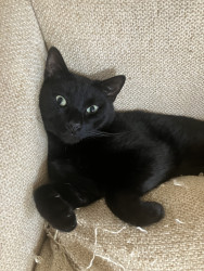 He has so many different sounds that he makes to let you know what he wants. He makes sad whiny sounds when he wants into a room he can’t push the door open to. When he really wants something bad like going out or going upstairs to spend time in the attic, he gets very loud and demanding. He will stand on his hind feet and give you that stare that only a black cat can give ! When he wants human attention he will jump up in your lap and cuddle.