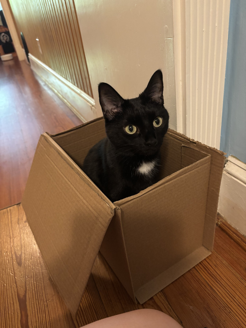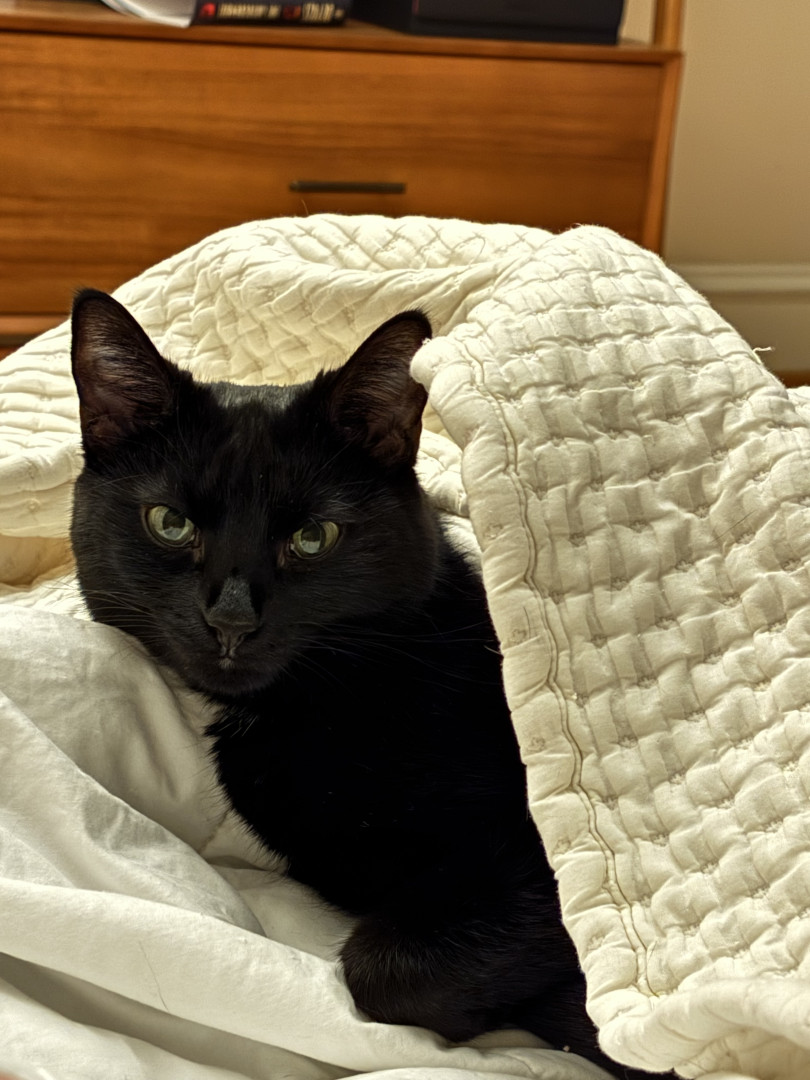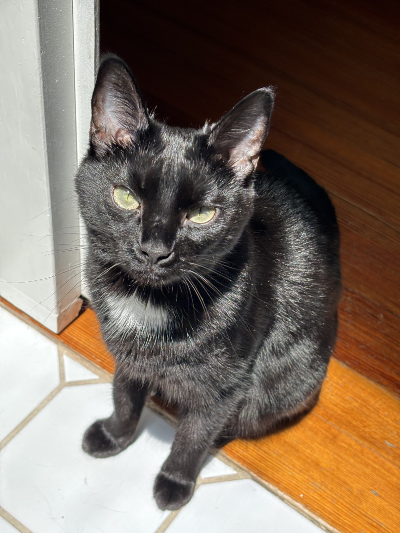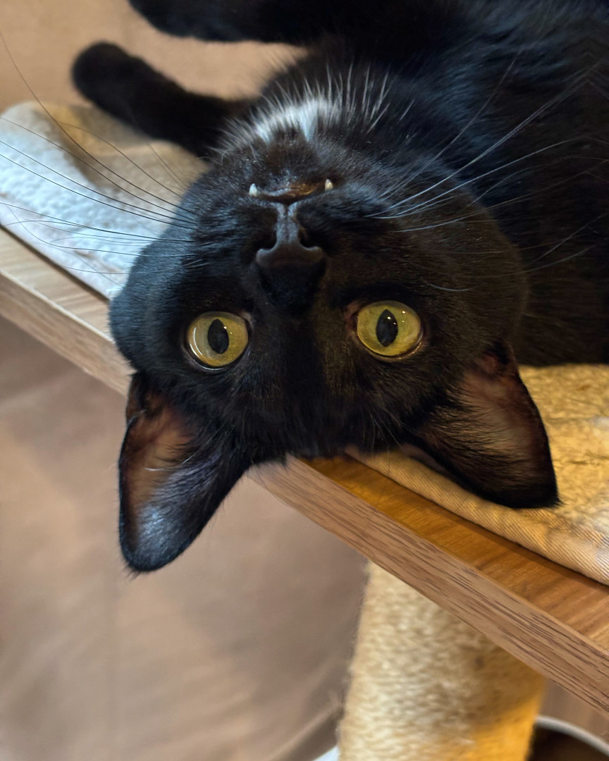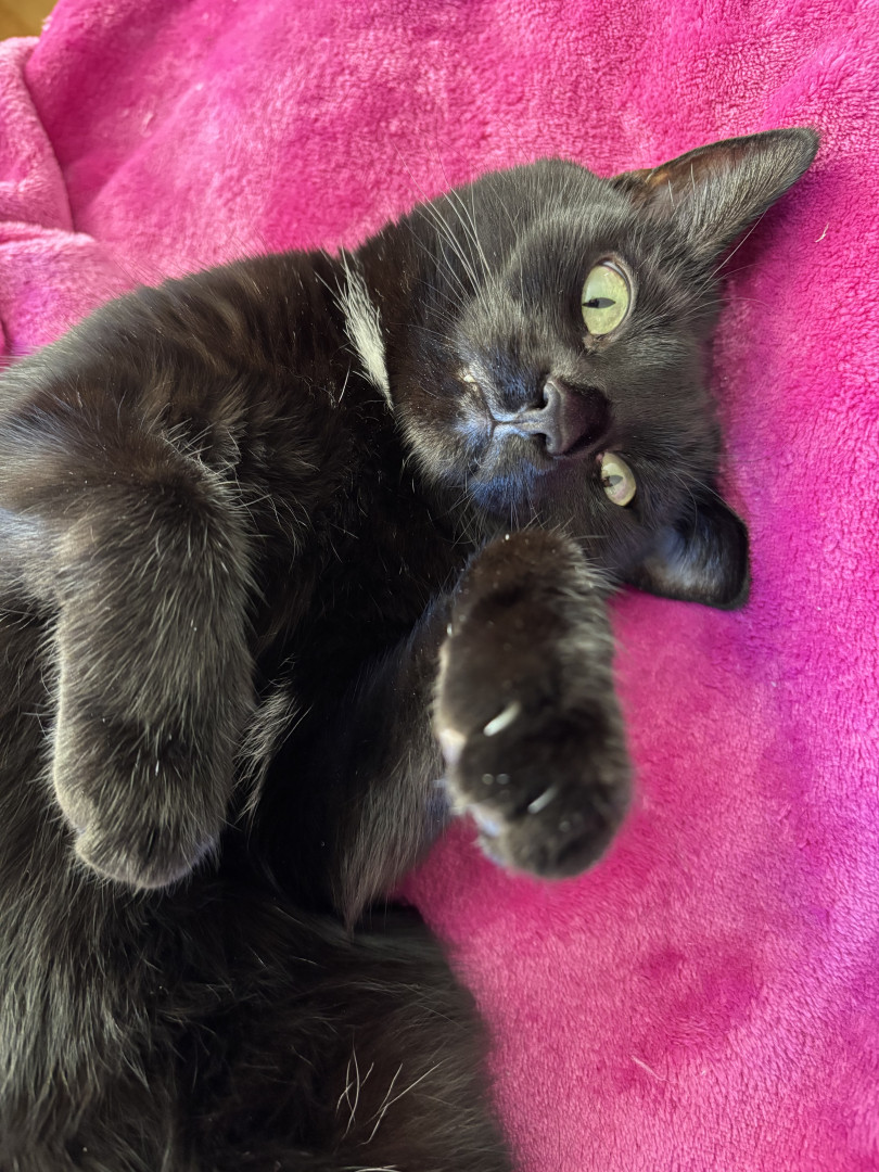 Salem has a big personality in a tiny package. She’s the queen of the castle, but she also has lots of love to give. She loves snugs, head butts, smooches, and showing off her vampire teefies.