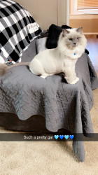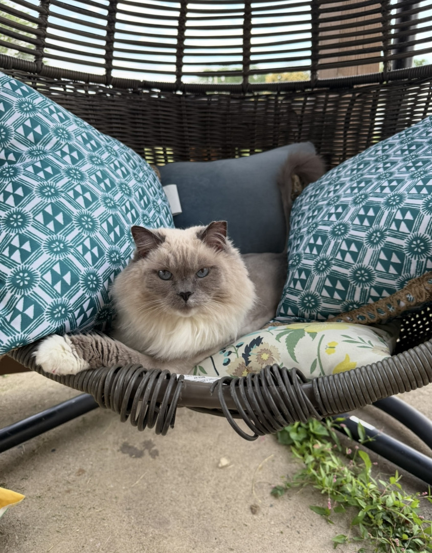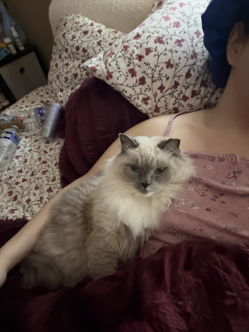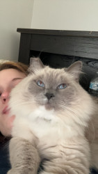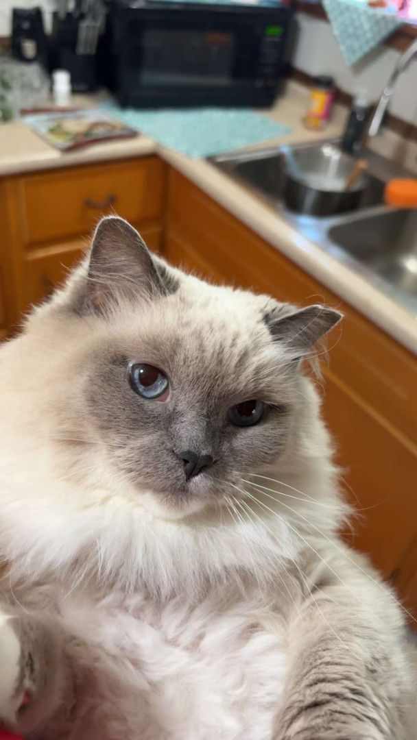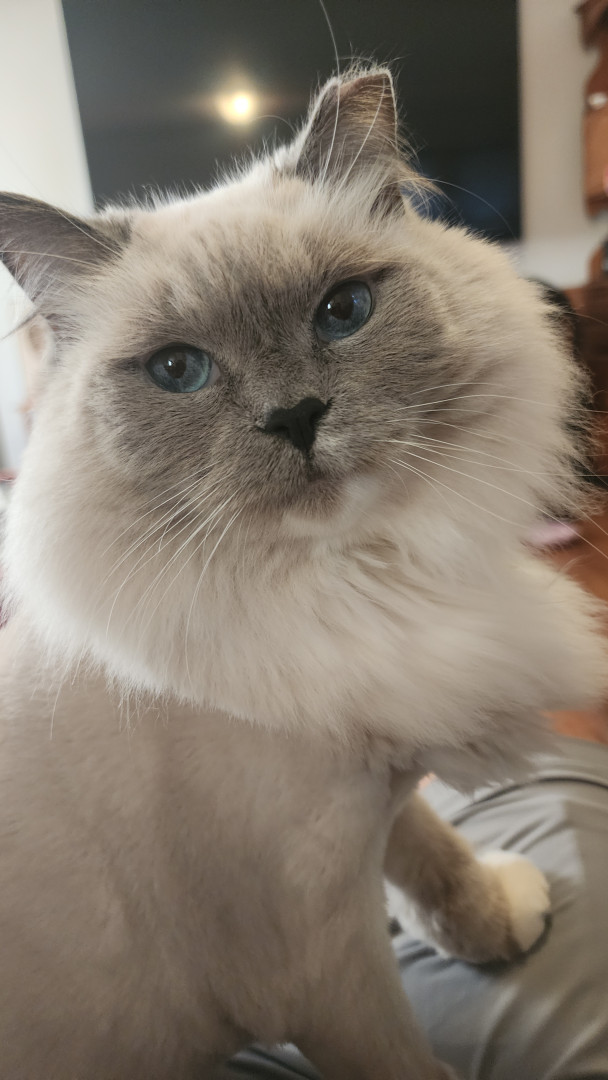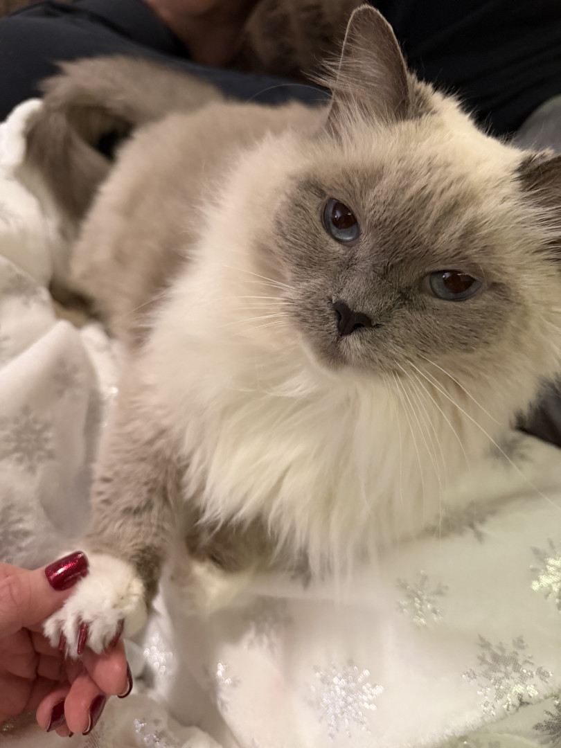 Sapphire is a fluffy blue-point Birman Siamese rescue with the softest fur, gentlest soul, and an endless motor of love-filled purrs.