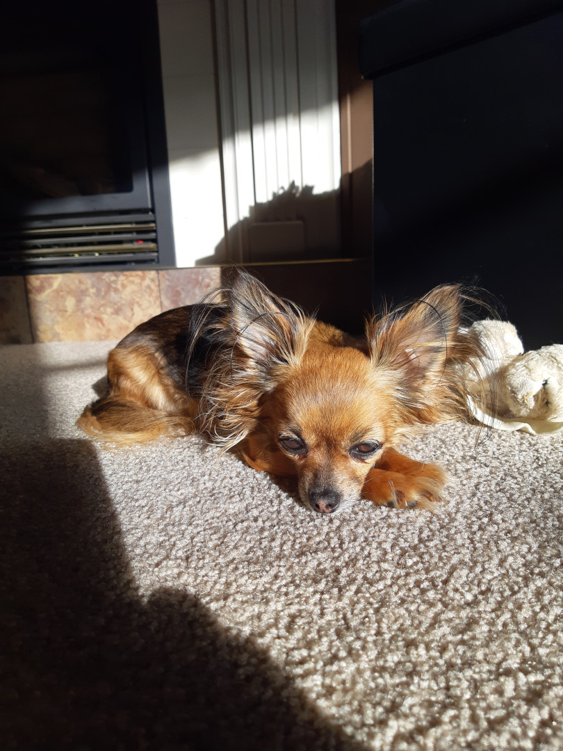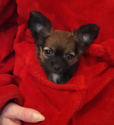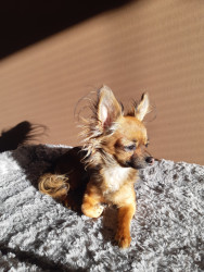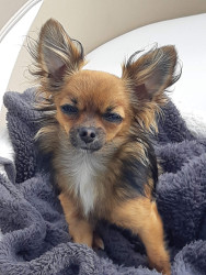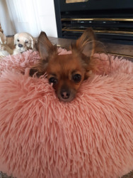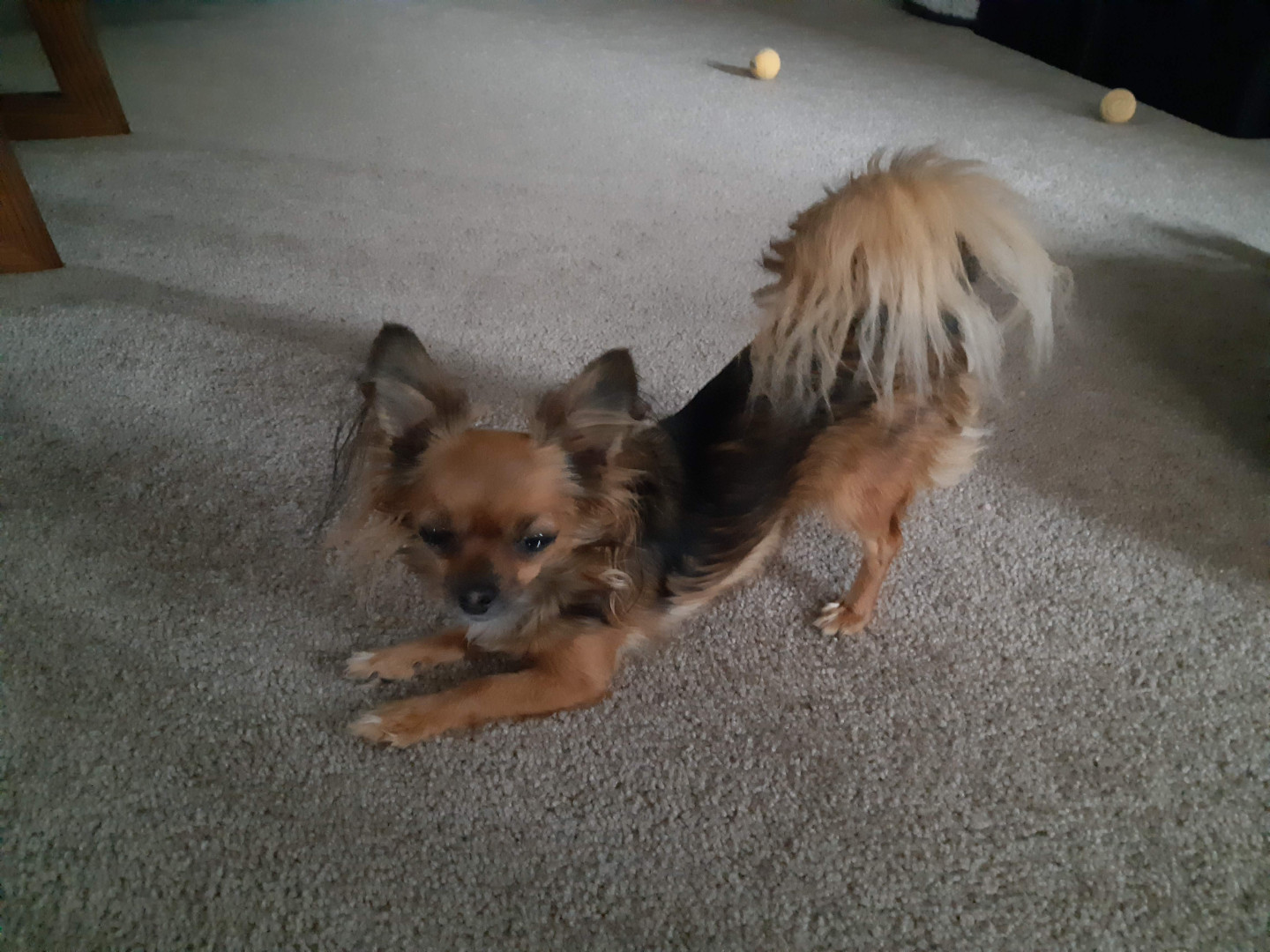 Sassy is a 3 lb Chihauhau. Of course she thinks she is big. She loves her people. She was named before we got her, name suits her to a T
