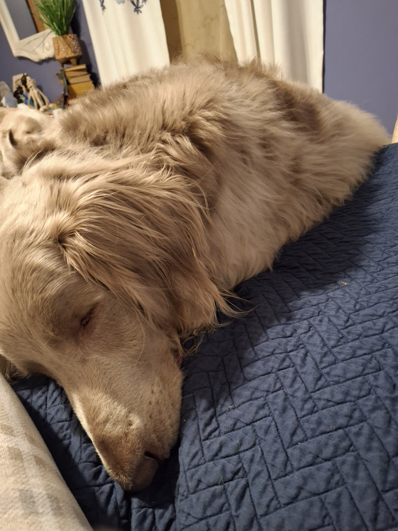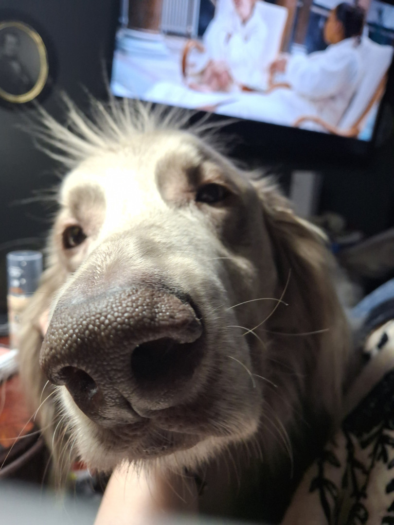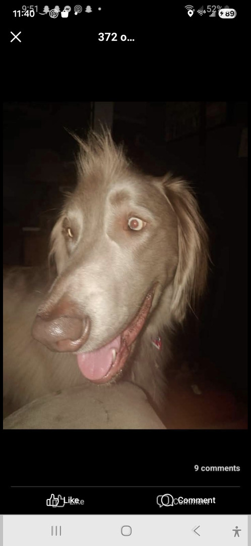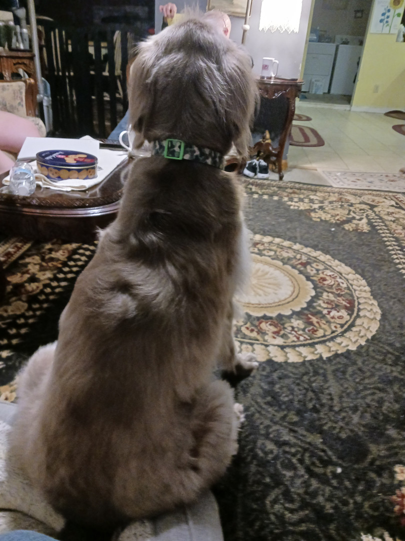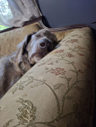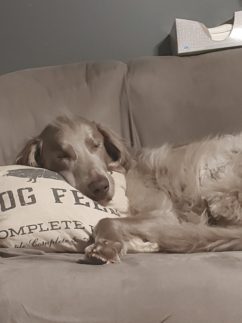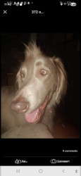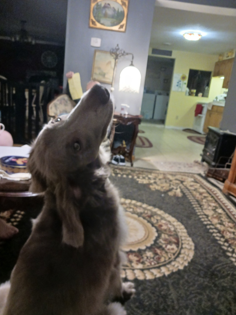 He's a long haired Weimaraner that I call my singing shadow. He follows me around everywhere and howls when we sing to music.