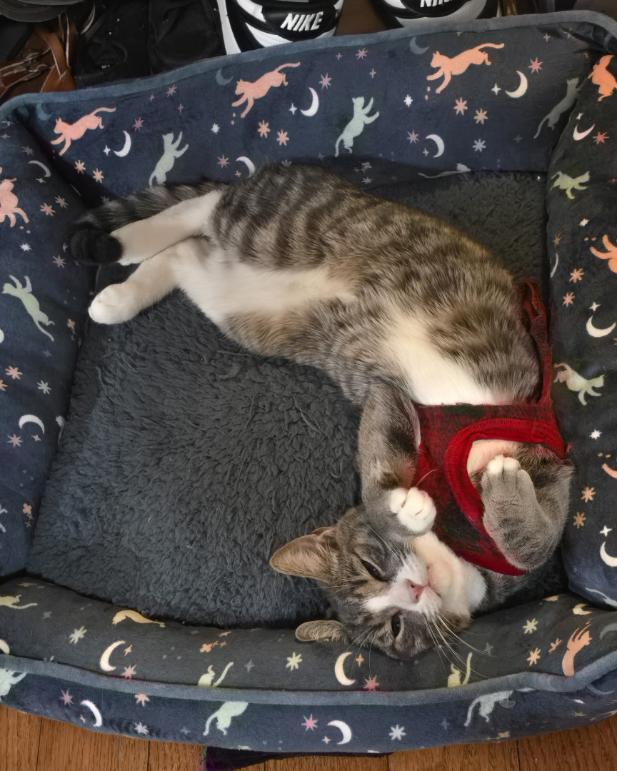 Her style of sitting/laying, she sort of folds her paws under, doesn't extends her paws out, we find that super cute!