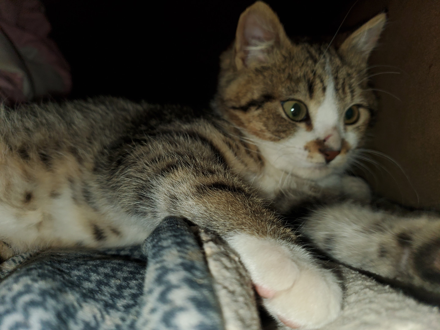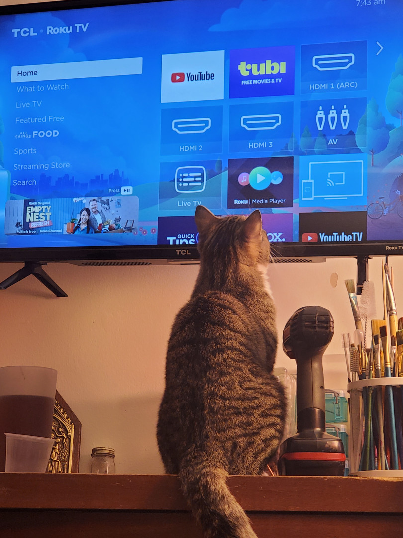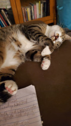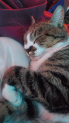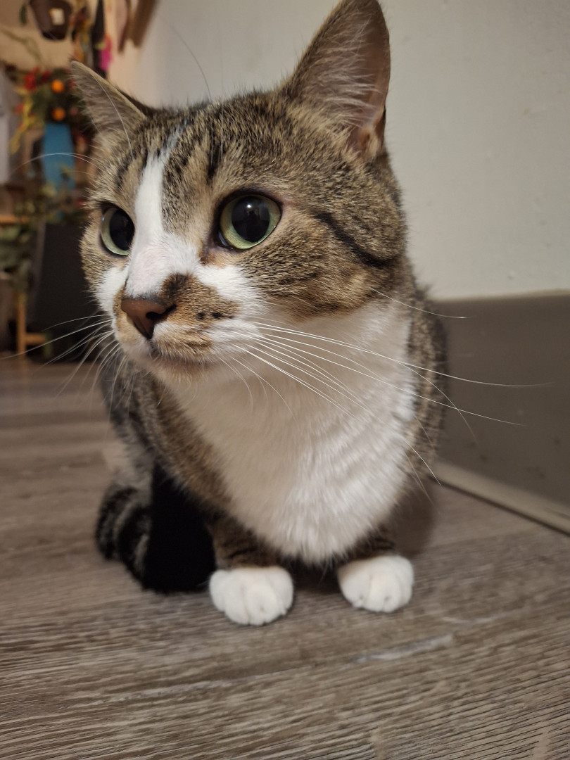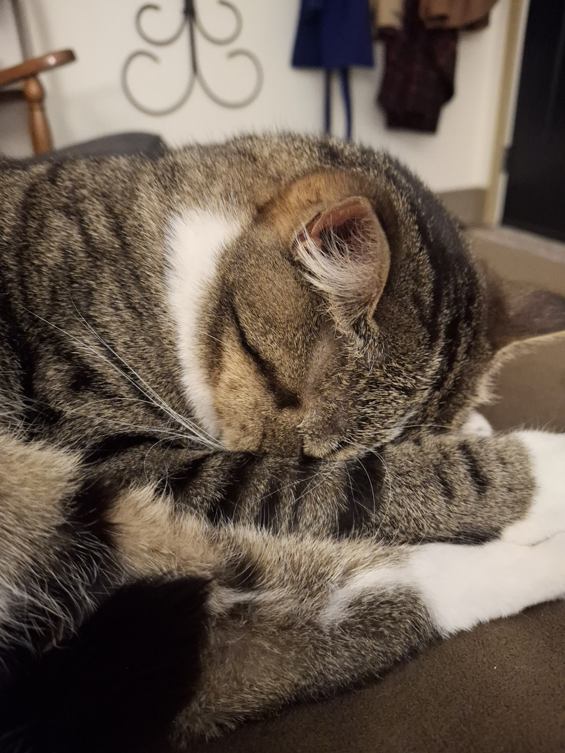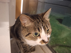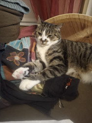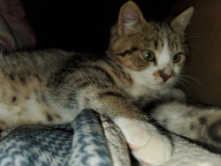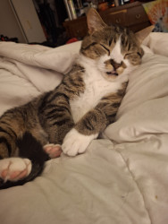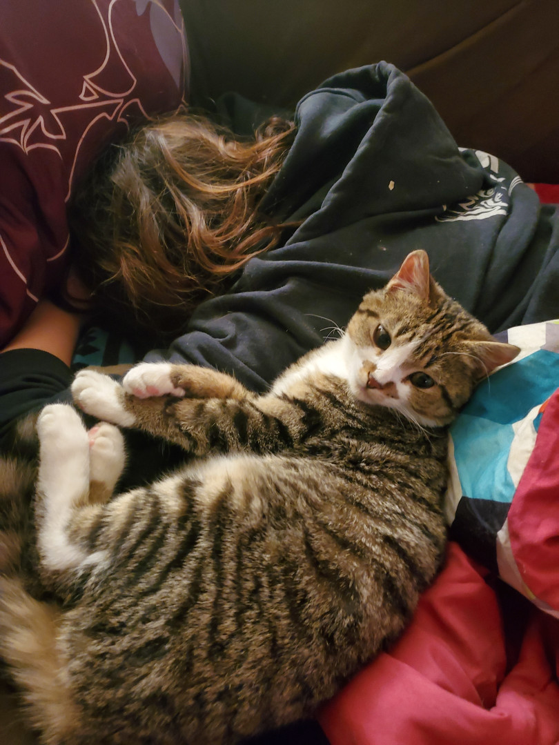 He is an all around good dude. He was only about 4 weeks old when we found him eating in the dumpster near our home. We took him home and cleaned him up and he became a part of our family. His favorite show is Donny loves Jenny. He loves to watch it after a lil catnip. He's mellow and a little shy and everyone who meets him loves him.