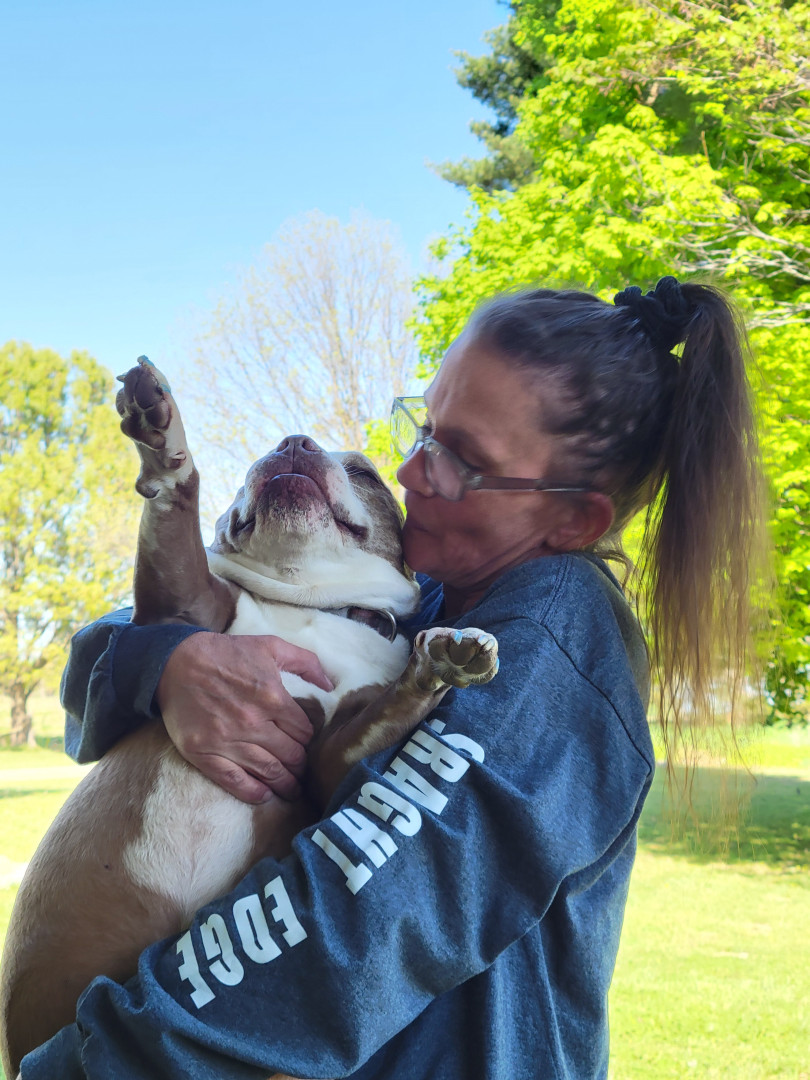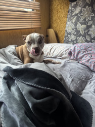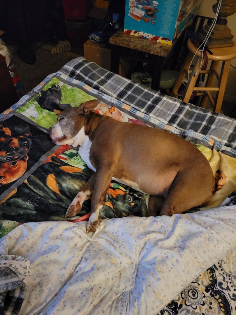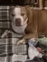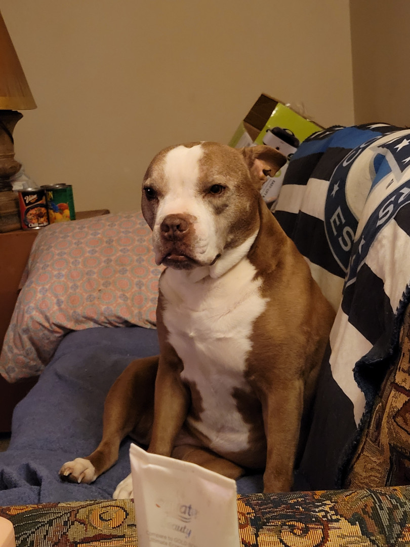 Shania is a red nose miniature Korean pit bully she will be 14 in March She has a triangle on the back of her neck and a thumbprint on the top of her head. She has gold eyes and she loves people and kids. She doesn’t know what a stranger is. She’s a very lovable dog. she loves to go for car rides and see her friends. She is my world. I love her so much